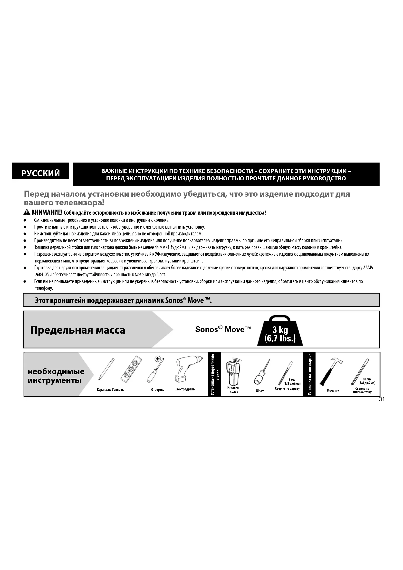 ВАЖНЫЕ ИНСТРУКЦИИ ПО ТЕХНИКЕ БЕЗОПАСНОСТИ – СОХРАНИТЕ ЭТИ ИНСТРУКЦИИ – ПЕРЕД ЭКСПЛУАТАЦИЕЙ ИЗДЕЛИЯ ПОЛНОСТЬЮ ПРОЧТИТЕ ДАННОЕ РУКОВОДСТВО Этот кронштейн поддерживает динамик Sonos® Move ™. ● См. специальные требования к установке колонки в инструкции к колонке. ● Прочтите данную инструкцию полностью, чтобы уверенно и с легкостью выполнить установку. ● Не используйте данное изделие для какой-либо цели, явно не оговоренной производителем. ● Производитель не несет ответственности за повреждение изделия или получение пользователем изделия травмы по причине его неправильной сборки или эксплуатации. ● Толщина деревянной стойки или гипсокартона должна быть не менее 44 мм (1