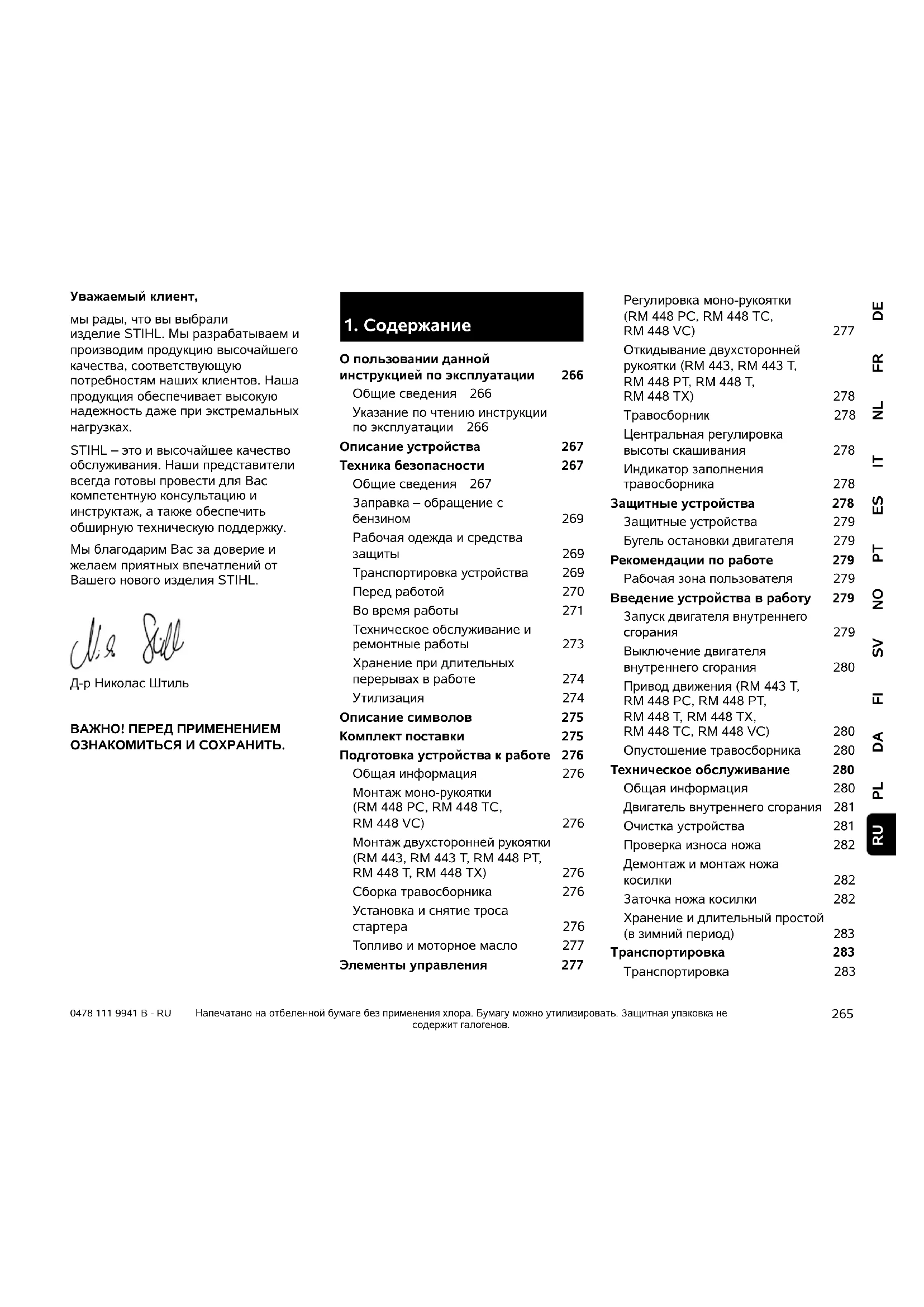 О пользовании данной инструкцией по эксплуатации 266 Общие сведения 266 Указание по чтению инструкции по эксплуатации 266 Описание устройства 267 Техника безопасности 267 Общие сведения 267 Заправка – обращение с бензином 269 Рабочая одежда и средства защиты 269 Транспортировка устройства 269 Перед работой 270 Во время работы 271 Техническое обслуживание и ремонтные работы 273 Хранение при длительных перерывах в работе 274 Утилизация 274 Описание символов 275 Комплект поставки 275 Подготовка устройства к работе 276 Общая информация 276 Монтаж моно-рукоятки (RM 448 PC, RM 448 TC, RM 448 VC) 276 Монтаж двухсторонней рукоятки (RM 443, RM 443 T, RM 448 PT, RM448T, RM448TX) 276 Сборка травосборника 276 Установка и снятие троса стартера 276 Топливо и моторное масло 277 Элементы управления 277 Регулировка моно-рукоятки (RM 448 PC, RM 448 TC, RM 448 VC) 277 Откидывание двухсторонней рукоятки (RM 443, RM 443 T, RM 448 PT, RM 448 T, RM 448 TX) 278 Травосборник 278 Центральная регулировка высоты скашивания 278 Индикатор заполнения травосборника 278 Защитные устройства 278 Защитные устройства 279 Бугель остановки двигателя 279 Рекомендации по работе 279 Рабочая зона пользователя 279 Введение устройства в работу 279 Запуск двигателя внутреннего сгорания 279 Выключение двигателя внутреннего сгорания 280 Привод движения (RM 443 T, RM 448 PC, RM 448 PT, RM 448 T, RM 448 TX, RM 448 TC, RM 448 VC) 280 Опустошение травосборника 280 Техническое обслуживание 280 Общая информация 280 Двигатель внутреннего сгорания 281 Очистка устройства 281 Проверка износа ножа 282 Демонтаж и монтаж ножа косилки 282 Заточка ножа косилки 282 Хранение и длительный простой (в зимний период)283 Транспортировка 283 Транспортировка 2830478 111 9941 B - RU
