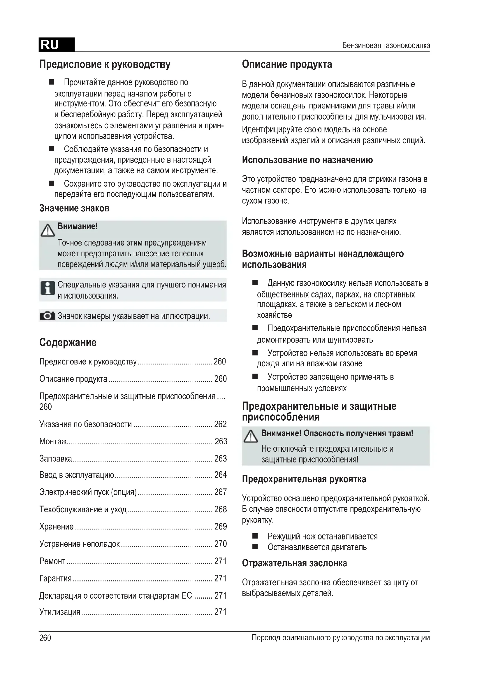 Предисловиекруководству .................................... 260 Описаниепродукта .................................................. 260 Предохранительныеизащитныеприспособления ....