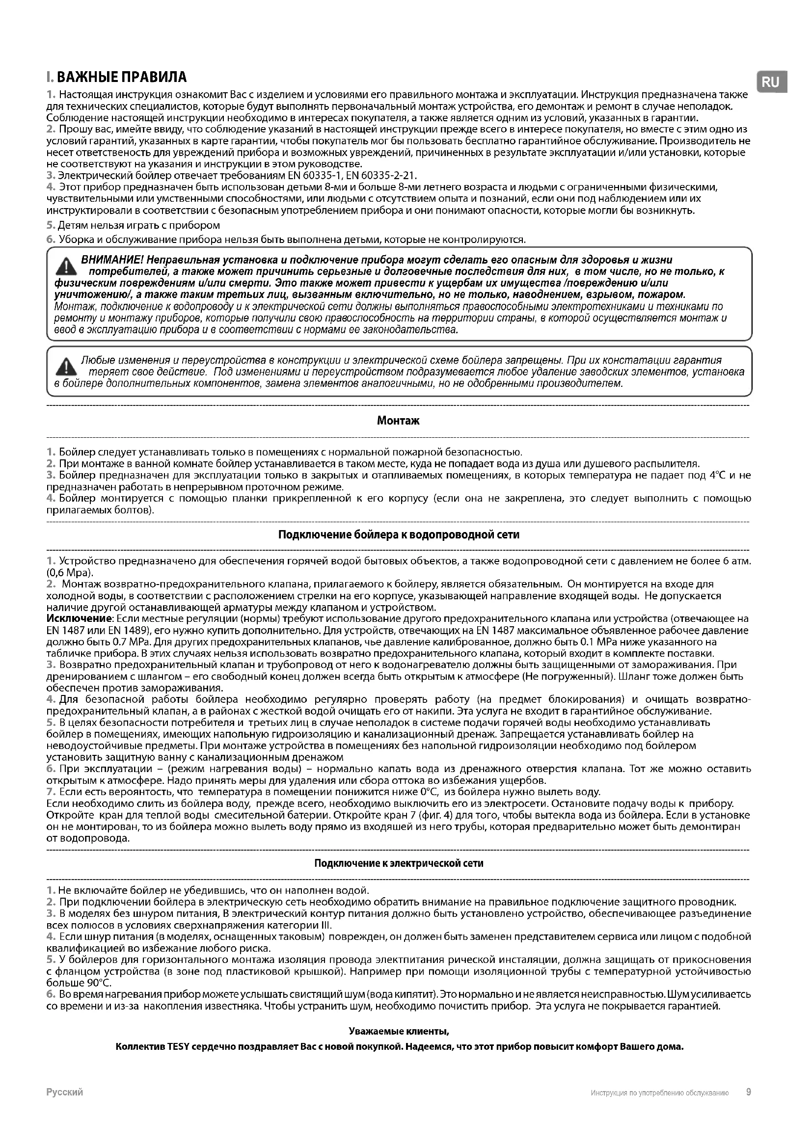 2. При подключении бойлера в электрическую сеть необходимо обратить внимание на правильное подключение защитного проводник. 3. В моделях без шнуром питания, В электрический контур питания должно быть установлено устройство, обеспечивающее разъединение всех полюсов в условиях сверхнапряжения категории III. 4. Если шнур питания (в моделях, оснащенных таковым) поврежден, он должен быть заменен представителем сервиса или лицом с подобной квалификацией во избежание любого риска. 5. У бойлеров для горизонтального монтажа изоляция провода электпитания рической инсталяции, должна защищать от прикосновения с фланцом устройства (в зоне под пластиковой крышкой). Например при помощи изоляционной трубы с температурной устойчивостью больше 90°C. 6. Во время нагревания прибор можете услышать свистящий шум (вода кипятит). Это нормально и не является неисправностью. Шум усиливаетсь со времени и из-за накопления известняка. Чтобы устранить шум, необходимо почистить прибор. Эта услуга не покрывается гарантией. Уважаемые клиенты, Коллектив TESY сердечно поздравляет Вас с новой покупкой. Надеемся, что этот прибор повысит комфорт Вашего дома.10 Инструкция по употреблению обслужванию