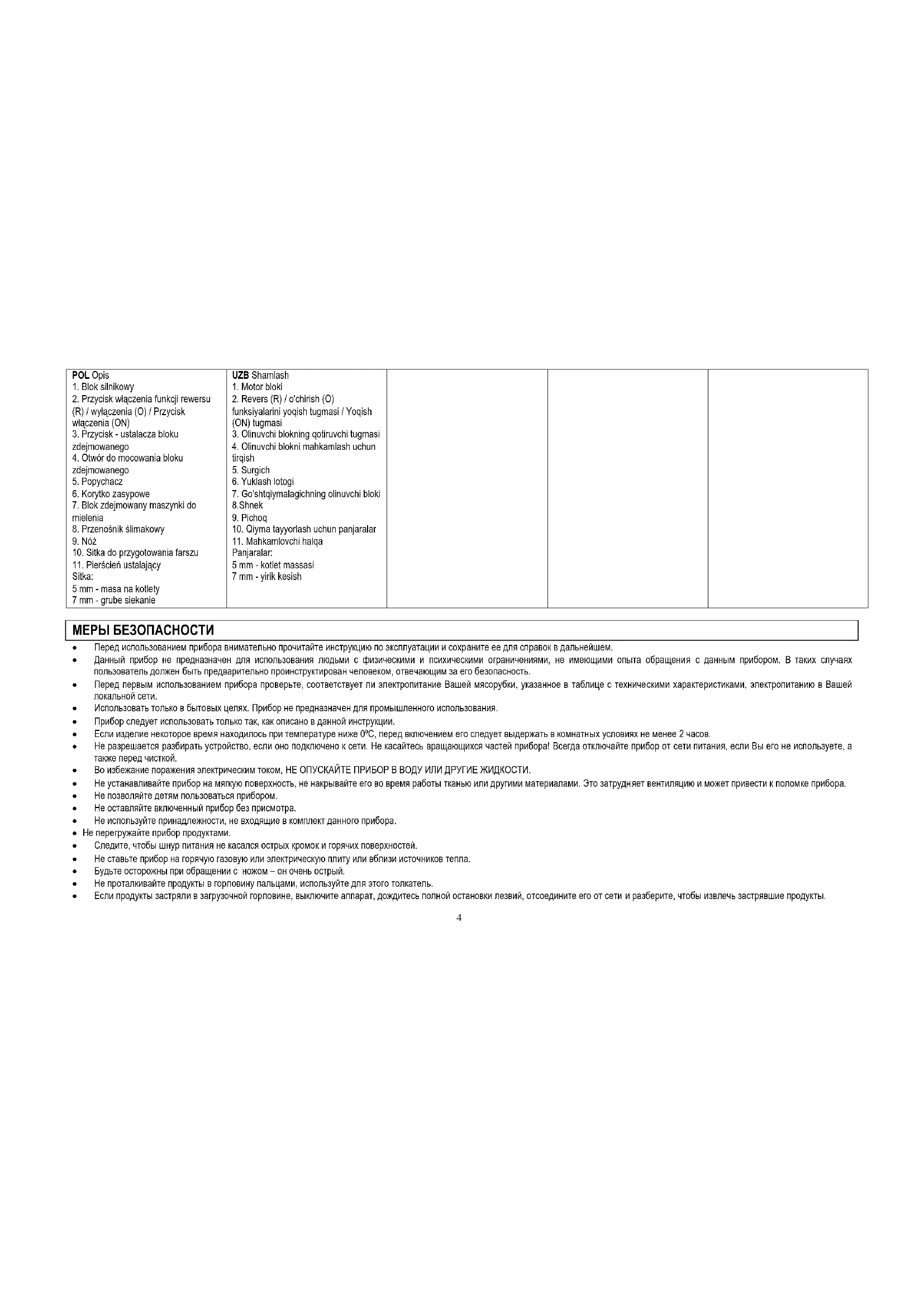 МЕРЫ БЕЗОПАСНОСТИ Перед использованием прибора внимательно прочитайте инструкцию по эксплуатации и сохраните ее для справок в дальнейшем. Данный прибор не предназначен для использования людьми с физическими и психическими ограничениями, не имеющими опыта обращения с данным прибором. В таких случаях пользователь должен быть предварительно проинструктирован человеком, отвечающим за его безопасность. Перед первым использованием прибора проверьте, соответствует ли электропитание Вашей мясорубки, указанное в таблице с техническими характеристиками, электропитанию в Вашей локальной сети. Использовать только в бытовых целях. Прибор не предназначен для промышленного использования. Прибор следует использовать только так, как описано в данной инструкции. Если изделие некоторое время находилось при температуре ниже 0ºC, перед включением его следует выдержать в комнатных условиях не менее 2 часов. Не разрешается разбирать устройство, если оно подключено к сети. Не касайтесь вращающихся частей прибора! Всегда отключайте прибор от сети питания, если Вы его не используете, а также перед чисткой. Во избежание поражения электрическим током, НЕ ОПУСКАЙТЕ ПРИБОР В ВОДУ ИЛИ ДРУГИЕ ЖИДКОСТИ. Не устанавливайте прибор на мягкую поверхность, не накрывайте его во время работы тканью или другими материалами. Это затрудняет вентиляцию и может привести к поломке прибора. Не позволяйте детям пользоваться прибором. Не оставляйте включенный прибор без присмотра. Не используйте принадлежности, не входящие в комплект данного прибора. Не перегружайте прибор продуктами. Следите, чтобы шнур питания не касался острых кромок и горячих поверхностей. Не ставьте прибор на горячую газовую или электрическую плиту или вблизи источников тепла. Будьте осторожны при обращении с ножом – он очень острый. Не проталкивайте продукты в горловину пальцами, используйте для этого толкатель. Если продукты застряли в загрузочной горловине, выключите аппарат, дождитесь полной остановки лезвий, отсоедините его от сети и разберите, чтобы извлечь застрявшие продукты.5 При перемещении не держите аппарат за загрузочный лоток или загрузочную горловину. Держите аппарат обеими руками за корпус. Не используйте прибор с поврежденным электрошнуром. Не измельчайте в мясорубке твердые продукты (кости, имбирь, орехи и т.п.) Рекомендуемое максимальное время непрерывной работы - не более 5 минут с обязательным перерывом не менее 10 минут. Если сработала система защиты от перегрева двигателя, не включайте прибор в течение 60 минут, пока он полностью не остынет. Не пытайтесь самостоятельно ремонтировать прибор. При обнаружении неполадок в работе прибора обращайтесь в ближайший сервисный центр. В процессе использования прибора, блок мясорубки имеет небольшой люфт, что не является неполадкой. Не перекручивайте сильно фиксирующее кольцо, чтобы остановить движение, это может привести к поломке. Съемные металлические детали мясорубки (шнек, решетки, нож) могут окислиться после использования. Это нормально и не является неисправностью. ПЕРЕД ПЕРВЫМ ИСПОЛЬЗОВАНИЕМ Распакуйте прибор и удалите все этикетки. Проверьте наличие всех компонентов прибора и отсутствие повреждений. Очистите прибор согласно разделу «Чистка и уход». Не погружайте моторный блок в воду. Перед сборкой все част