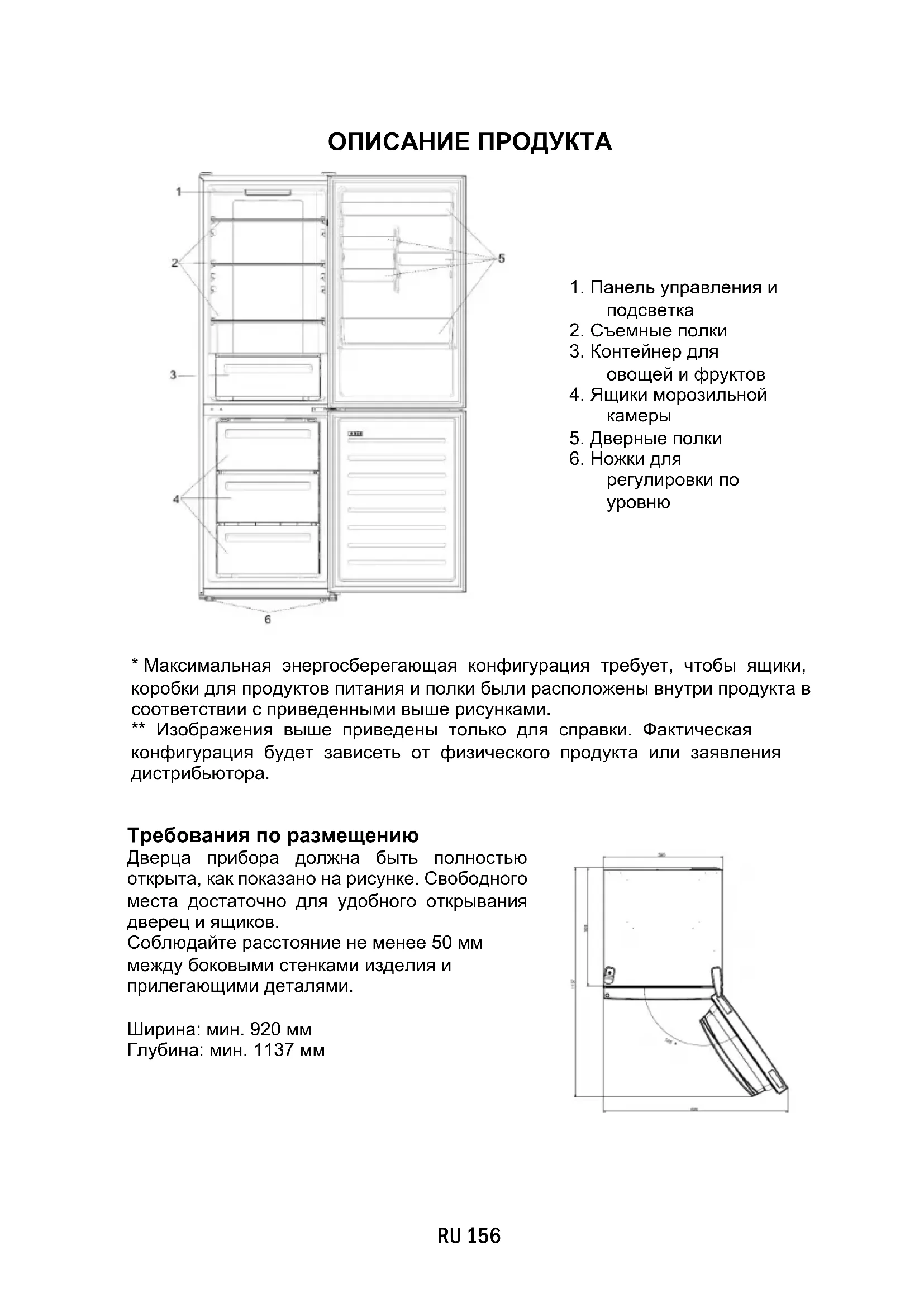 - Максимальная энергосберегающая конфигурация требует, чтобы ящики, коробки для продуктов питания и полки были расположены внутри продукта в соответствии с приведенными выше рисунками. ** Изображения выше приведены только для справки. Фактическая конфигурация будет зависеть от физического продукта или заявления дистрибьютора. Требования по размещению Дверца прибора должна быть полностью открыта, как показано на рисунке. Свободного места достаточно для удобного открывания дверец и ящиков. Соблюдайте расстояние не менее 50 мм между боковыми стенками изделия и прилегающими деталями. Ширина: мин. 920 мм Глубина: мин. 1137 ммИСПОЛЬЗОВАНИЕ ➀ Кнопка ВКЛ/ВЫКЛ, используемая для включения/выключения прибора. ➁ Кнопка Mode, используемая для выбора температуры холодильного отсека или специальных функций. ➂ Значок Wi-Fi показывает, подключено ли устройство к приложению. ➃ Значок Super Cool показывает, активирована ли функция. ➄ Уровни температуры, показывающие, какая температура выбрана. Использование