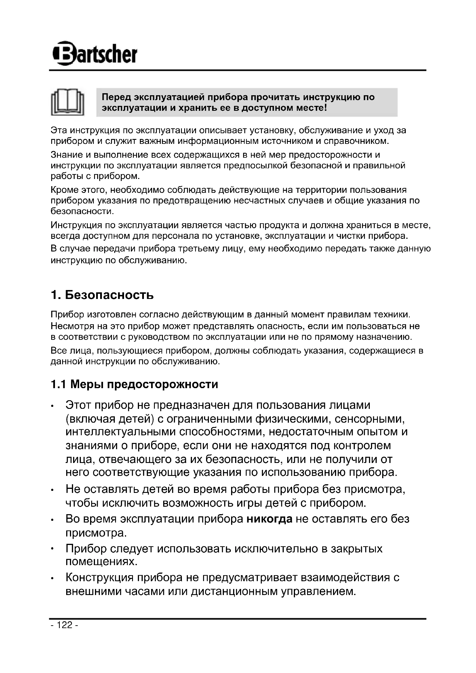 Перед эксплуатацией прибора прочитать инструкцию по эксплуатации и хранить ее в доступном месте! Эта инструкция по эксплуатации описывает установку, обслуживание и уход за прибором и служит важным информационным источником и справочником. Знание и выполнение всех содержащихся в ней мер предосторожности и инструкции по эксплуатации является предпосылкой безопасной и правильной работы с прибором. Кроме этого, необходимо соблюдать действующие на территории пользования прибором указания по предотвращению несчастных случаев и общие указания по безопасности. Инструкция по эксплуатации является частью продукта и должна храниться в месте, всегда доступном для персонала по установке, эксплуатации и чистки прибора. В случае передачи прибора третьему лицу, ему необходимо передать также данную инструкцию по обслуживанию.
