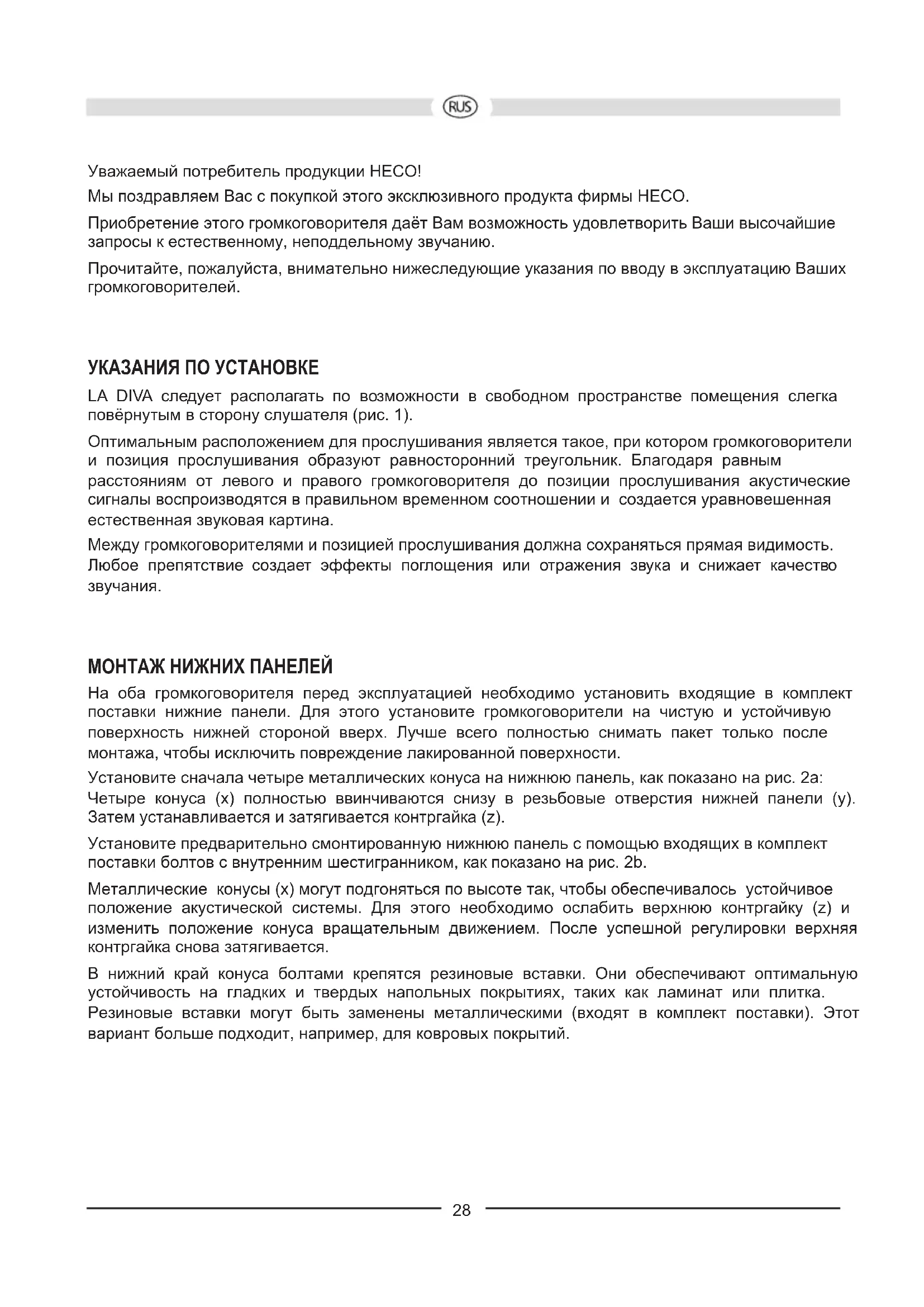 МОНТАЖ НИЖНИХ ПАНЕЛЕЙ На оба громкоговорителя перед эксплуатацией необходимо установить входящие в комплект поставки нижние панели. Для этого установите громкоговорители на чистую и устойчивую поверхность нижней стороной вверх. Лучше всего полностью снимать пакет только после монтажа, чтобы исключить повреждение лакированной поверхности. Установите сначала четыре металлических конуса на нижнюю панель, как показано на рис. 2a: Четыре конуса (x) полностью ввинчиваются снизу в резьбовые отверстия нижней панели (y). Затем устанавливается и затягивается контргайка (z). Установите предварительно смонтированную нижнюю панель с помощью входящих в комплект поставки болтов с внутренним шестигранником, как показано на рис. 2b. Металлические конусы (x) могут подгоняться по высоте так, чтобы обеспечивалось устойчивое положение акустической системы. Для этого необходимо ослабить верхнюю контргайку (z) и изменить положение конуса вращательным движением. После успешной регулировки верхняя контргайка снова затягивается. В нижний край конуса болтами крепятся резиновые вставки. Они обеспечивают оптимальную устойчивость на гладких и твердых напольных покрытиях, таких как ламинат или плитка. Резиновые вставки могут быть заменены металлическими (входят в комплект поставки). Этот вариант больше подходит, например, для ковровых покрытий.29