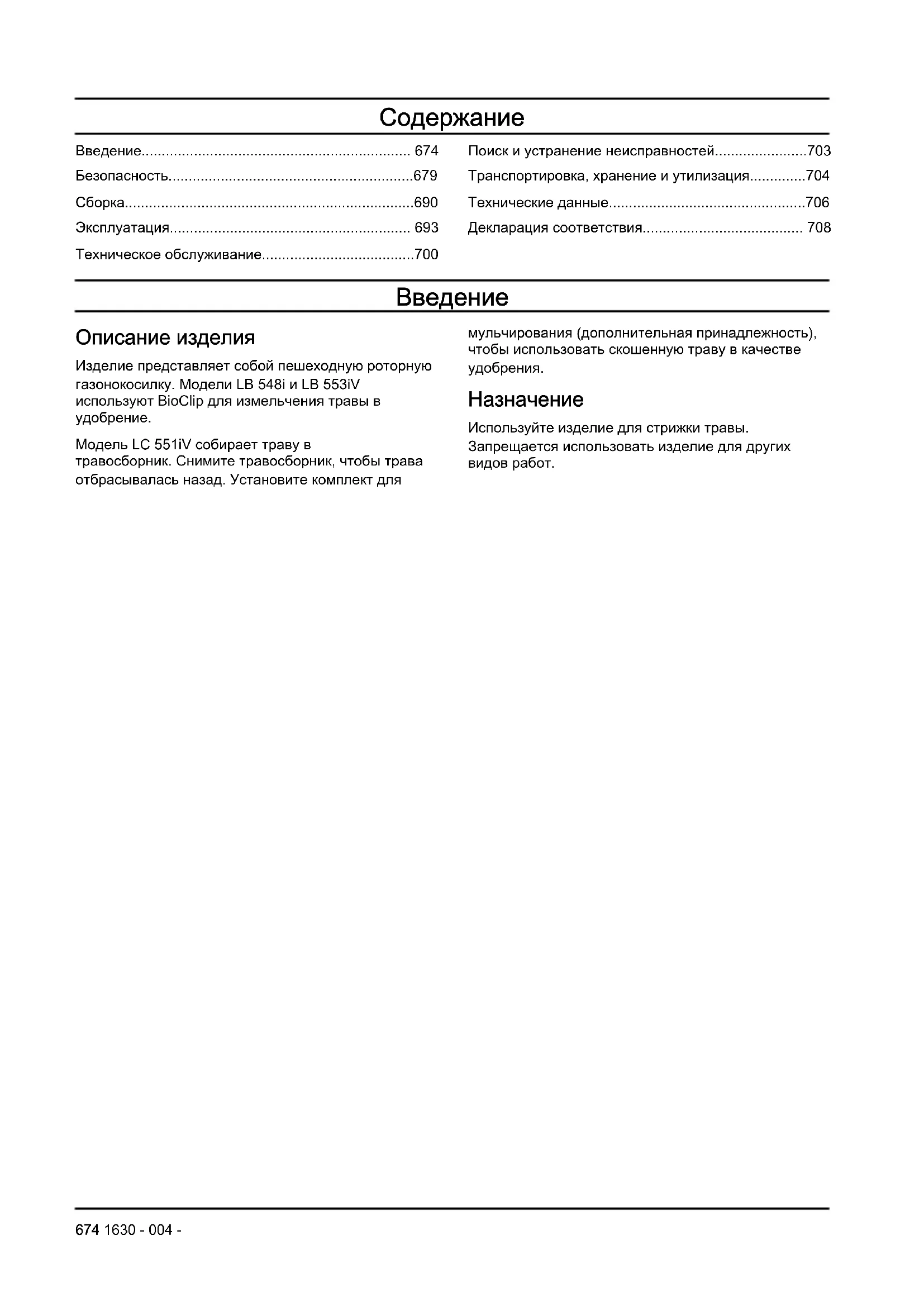 Описание изделия Изделие представляет собой пешеходную роторную газонокосилку. Модели LB 548i и LB553iV используют BioClip для измельчения травы в