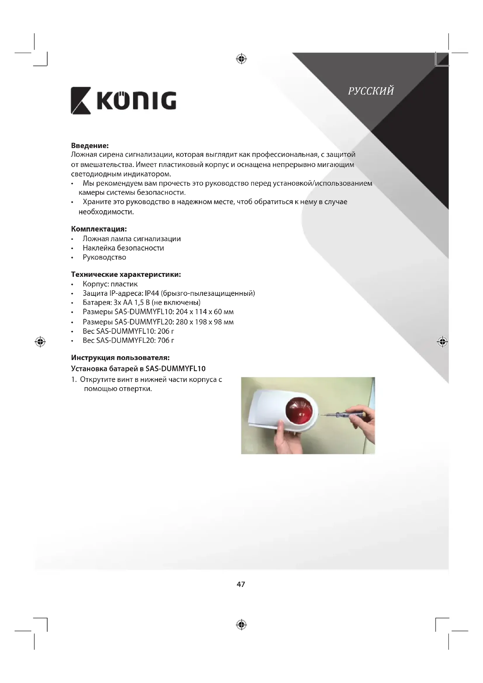 Скачайте инструкцию для вашего Сигнализация в формате PDF бесплатно! Найдите своё руководство SASDUMMYFL20 - KONIG и возьмите своё электронное устройство обратно в руки. На этой странице опубликованы все документы, необходимые для использования вашего устройства. SASDUMMYFL20 бренда KONIG.