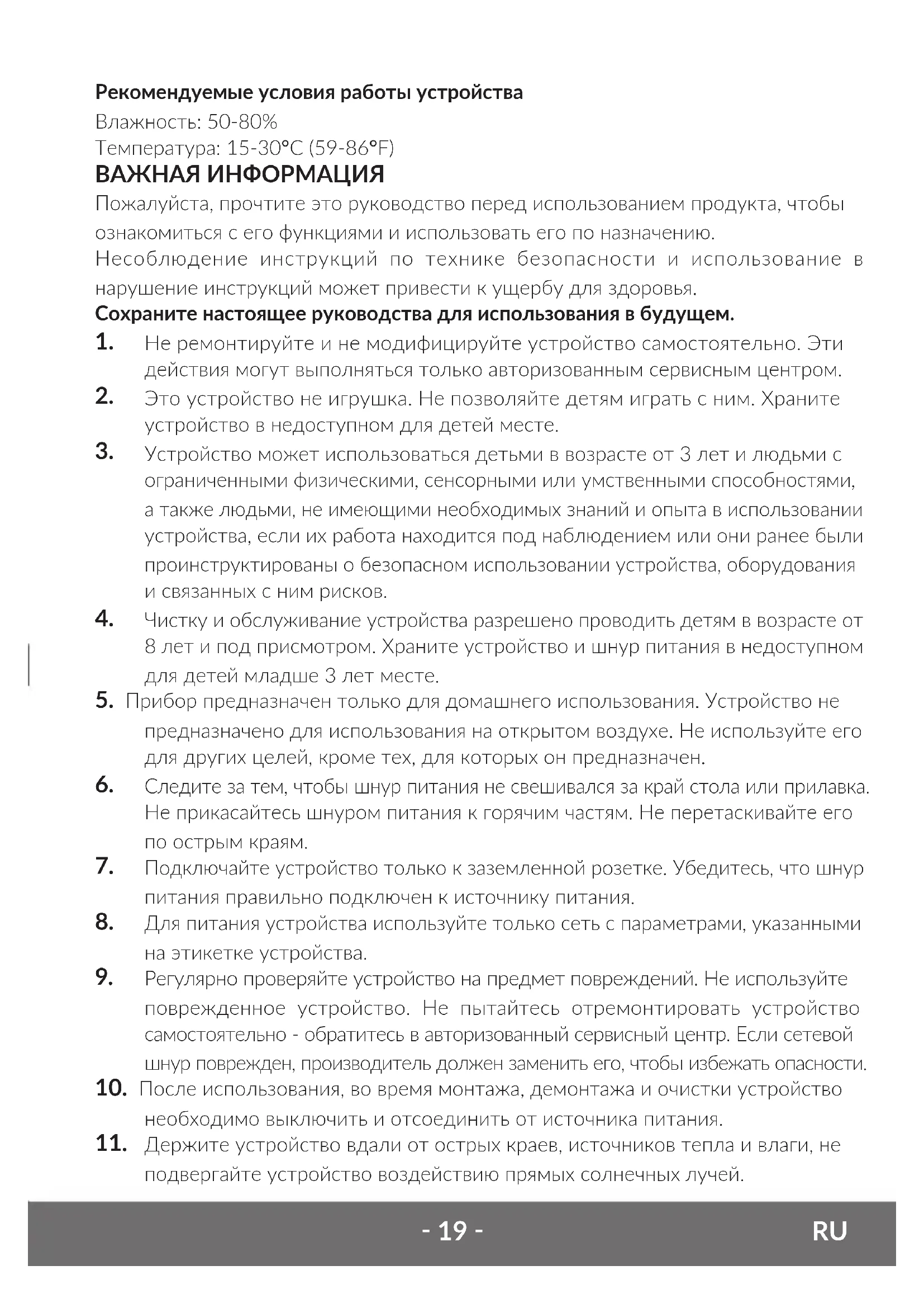 Чистку и обслуживание устройства разрешено проводить детям в возрасте от 8 лет и под присмотром. Храните устройство и шнур питания в недоступном для детей младше 3 лет месте.