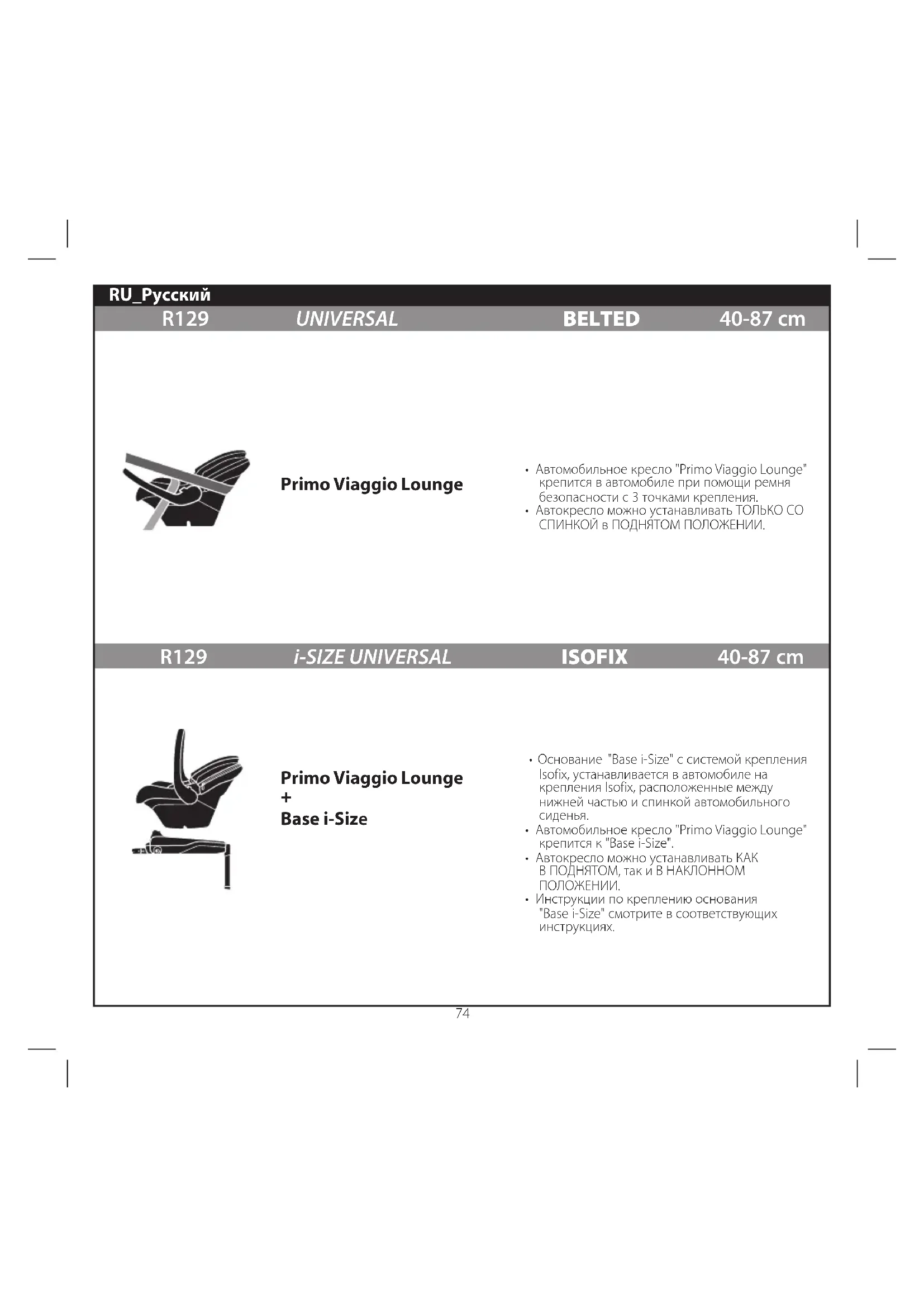 - Автокресло можно устанавливать ТОЛЬКО СО СПИНКОЙ в ПОДНЯТОМ ПОЛОЖЕНИИ. Primo Viaggio Lounge