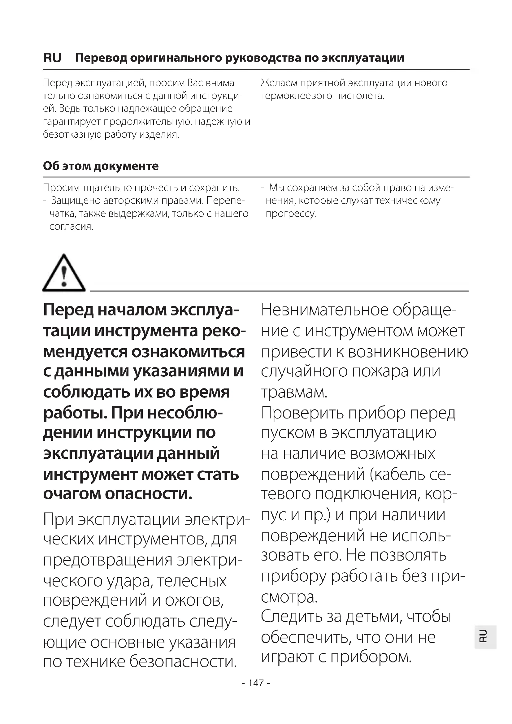Следить за детьми, чтобы обеспечить, что они не играют с прибором. Перед эксплуатацией, просим Вас внима- тельно ознакомиться с данной инструкци- ей. Ведь только надлежащее обращение гарантирует продолжительную, надежную и безотказную работу изделия. Желаем приятной эксплуатации нового термоклеевого пистолета. Перевод оригинального руководства по эксплуатации Об этом документе Просим тщательно прочесть и сохранить. - Защищено авторскими правами. Перепе- чатка, также выдержками, только с нашего