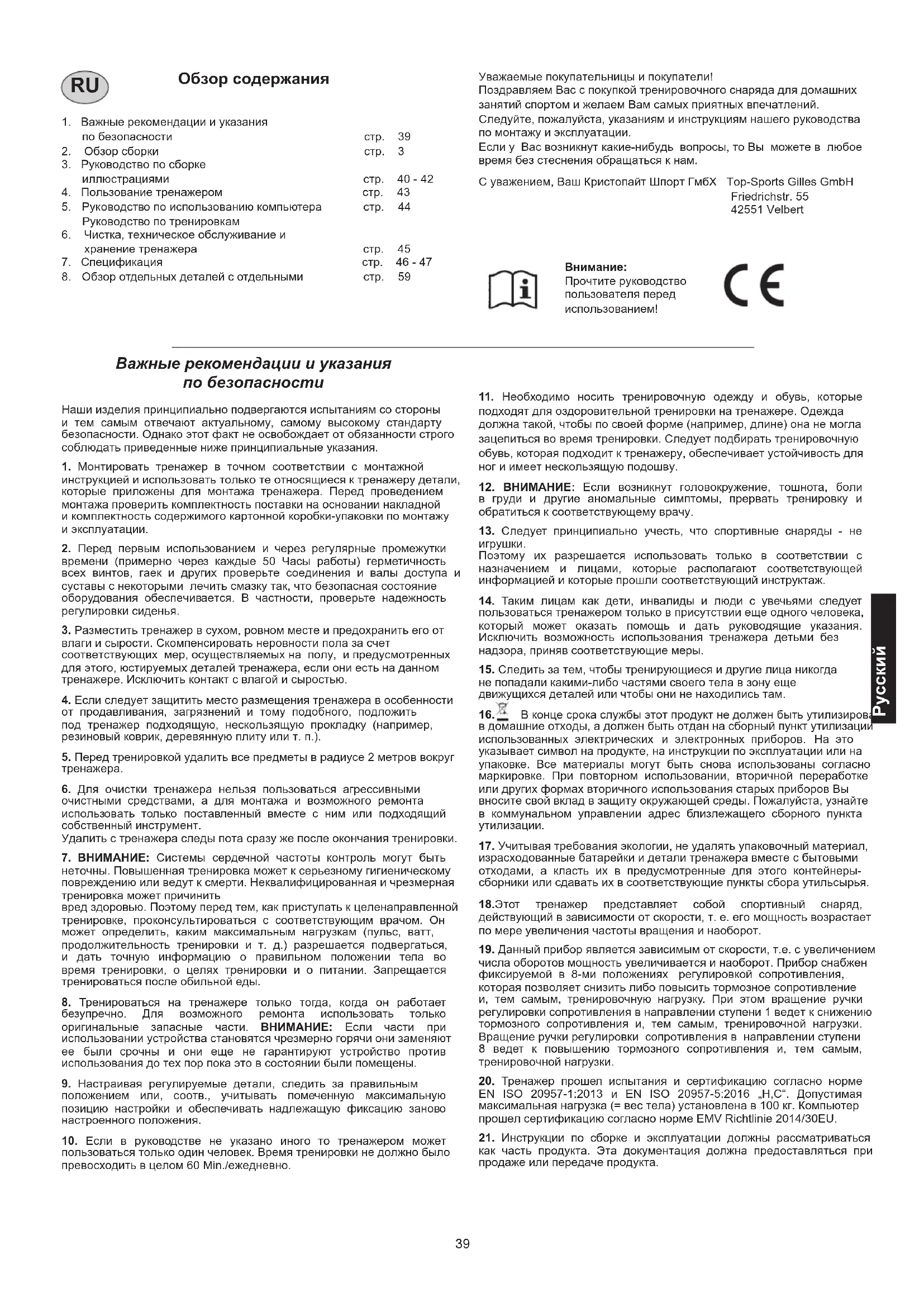 Уважаемые покупательницы и покупатели! Поздравляем Вас с покупкой тренировочного снаряда для домашних занятий спортом и желаем Вам самых приятных впечатлений. Следуйте, пожалуйста, указаниям и инструкциям нашего руководства по монтажу и эксплуатации. Если у Вас возникнут какие-нибудь вопросы, то Вы можете в любое время без стеснения обращаться к нам. С уважением, Ваш Кристопайт Шпорт ГмбХ Top-Sports Gilles GmbH Friedrichstr. 55 42551 Velbert