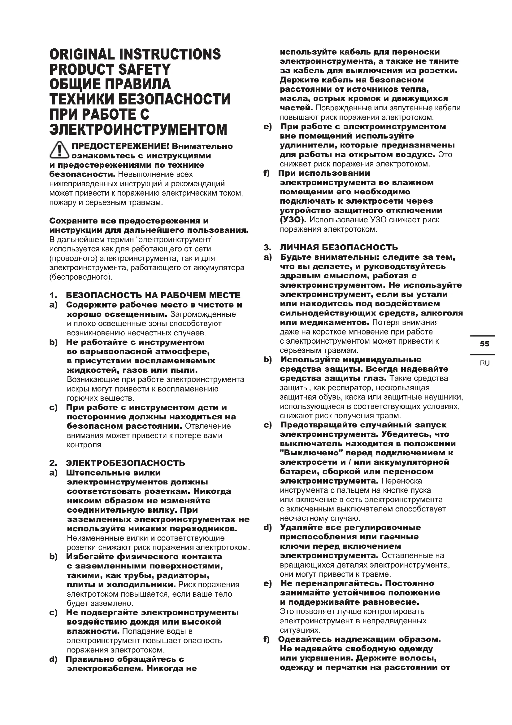 ПРЕДОСТЕРЕЖЕНИЕ! Внимательно ознакомьтесь с инструкциями и предостережениями по технике безопасности. Невыполнение всех нижеприведенных инструкций и рекомендаций может привести к поражению электрическим током, пожару и серьезным травмам. Сохраните все предостережения и инструкции для дальнейшего пользования. В дальнейшем термин “электроинструмент” используется как для работающего от сети (проводного) электроинструмента, так и для электроинструмента, работающего от аккумулятора (беспроводного).