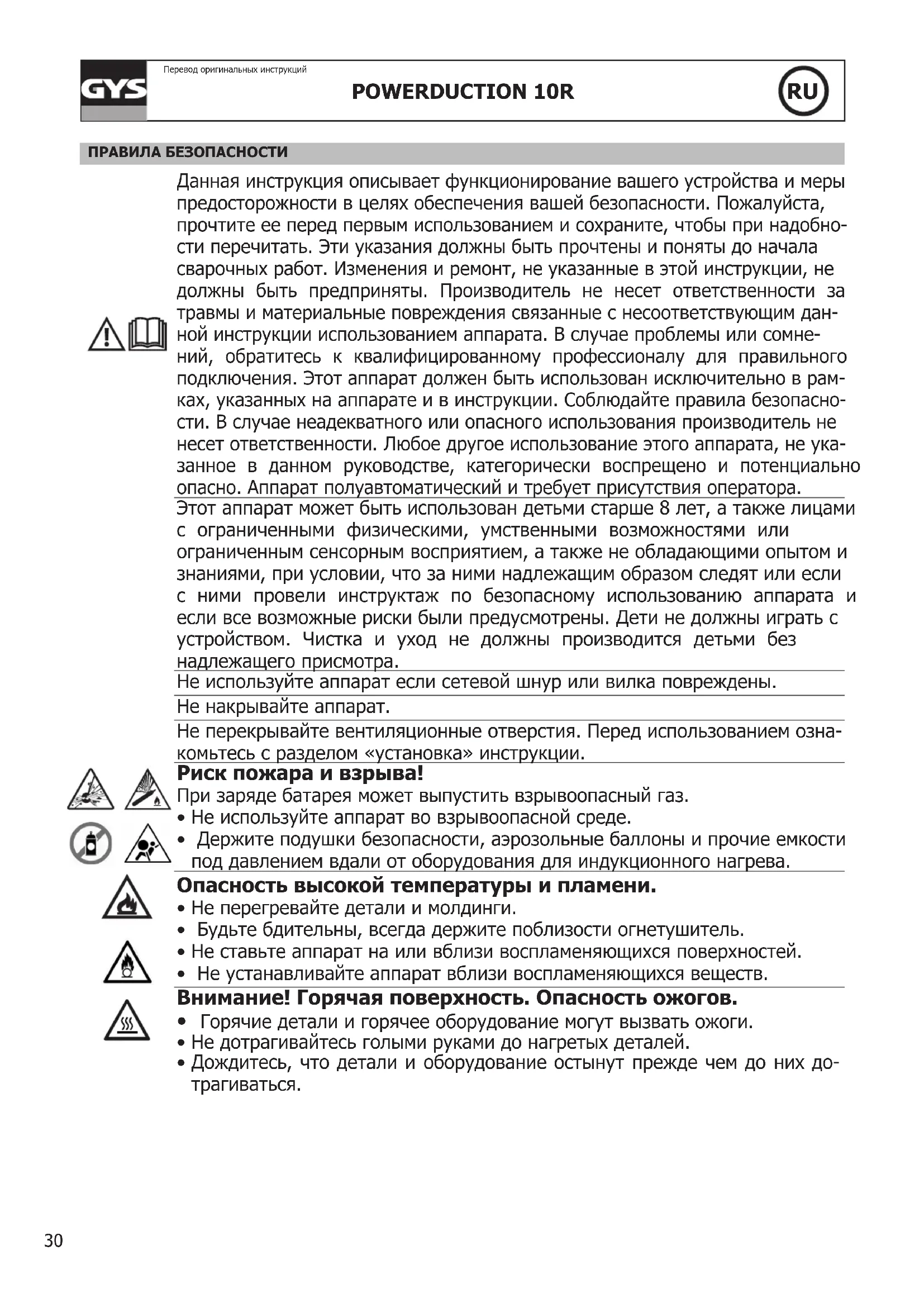 Traducción de las instrucciones originalesПеревод оригинальных инструкций ПРАВИЛА БЕЗОПАСНОСТИ Данная инструкция описывает функционирование вашего устройства и меры предосторожности в целях обеспечения вашей безопасности. Пожалуйста, прочтите ее перед первым использованием и сохраните, чтобы при надобно- сти перечитать. Эти указания должны быть прочтены и поняты до начала сварочных работ. Изменения и ремонт, не указанные в этой инструкции, не должны быть предприняты. Производитель не несет ответственности за травмы и материальные повреждения связанные с несоответствующим дан- ной инструкции использованием аппарата. В случае проблемы или сомне- ний, обратитесь к квалифицированному профессионалу для правильного подключения. Этот аппарат должен быть использован исключительно в рам- ках, указанных на аппарате и в инструкции. Соблюдайте правила безопасно- сти. В случае неадекватного или опасного использования производитель не несет ответственности. Любое другое использование этого аппарата, не ука- занное в данном руководстве, категорически воспрещено и потенциально опасно. Аппарат полуавтоматический и требует присутствия оператора. Этот аппарат может быть использован детьми старше 8 лет, а также лицами с ограниченными физическими, умственными возможностями или ограниченным сенсорным восприятием, а также не обладающими опытом и знаниями, при условии, что за ними надлежащим образом следят или если с ними провели инструктаж по безопасному использованию аппарата и если все возможные риски были предусмотрены. Дети не должны играть с устройством. Чистка и уход не должны производится детьми без надлежащего присмотра. Не используйте аппарат если сетевой шнур или вилка повреждены. Не накрывайте аппарат. Не перекрывайте вентиляционные отверстия. Перед использованием озна- комьтесь с разделом «установка» инструкции. Риск пожара и взрыва! При заряде батарея может выпустить взрывоопасный газ.