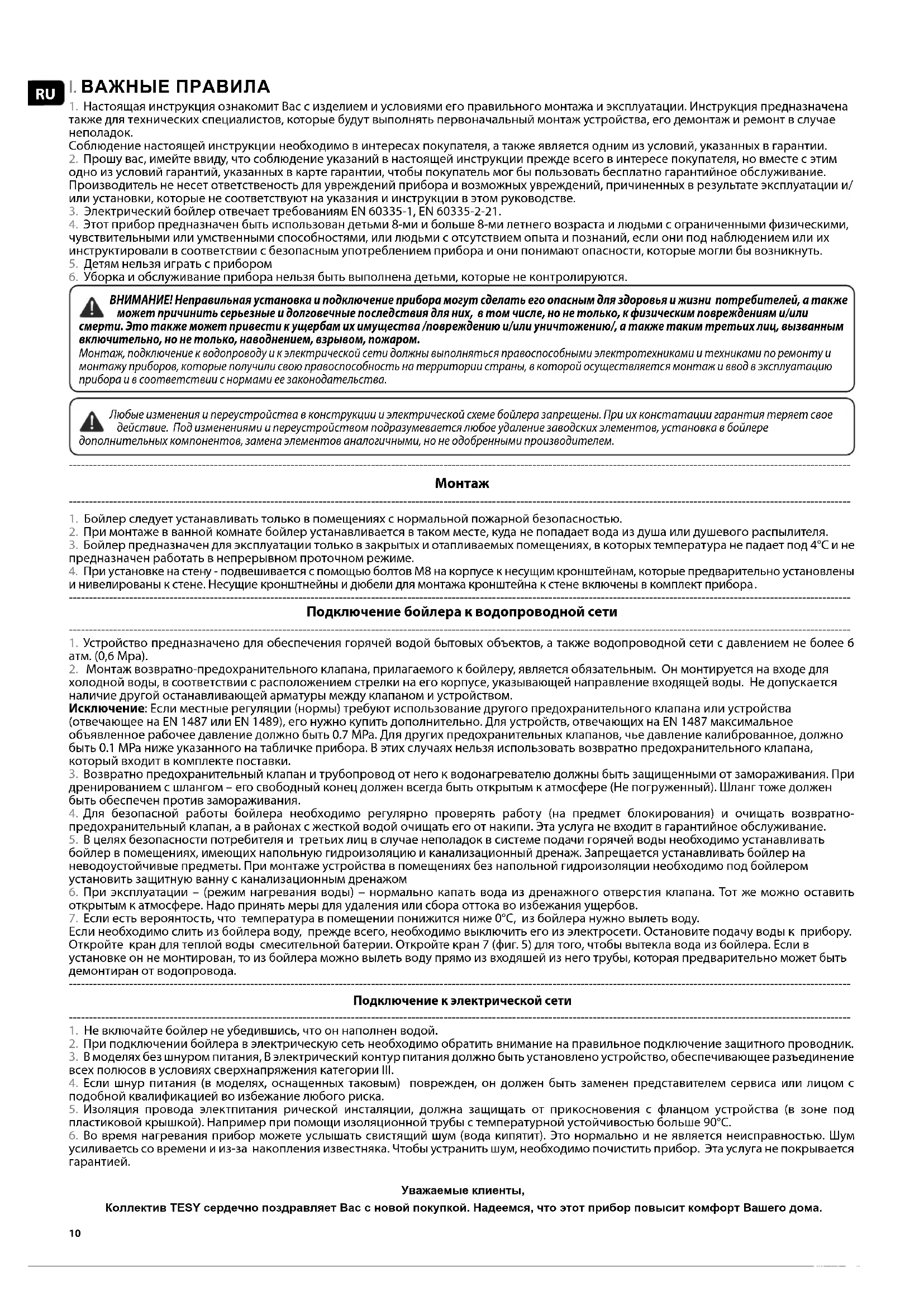 ВНИМАНИЕ! Неправильная установка и подключение прибора могут сделать его опасным для здоровья и жизни потребителей, а также может причинить серьезные и долговечные последствия для них, в том числе, но не только, к физическим повреждениям и/или смерти. Это также может привести к ущербам их имущества /повреждению и/или уничтожению/, а также таким третьих лиц, вызванным включительно, но не только, наводнением, взрывом, пожаром. Монтаж, подключение к водопроводу и к электрической сети должны выполняться правоспособными электротехниками и техниками по ремонту и монтажу приборов, которые получили свою правоспособность на территории страны, в которой осуществляется монтаж и ввод в эксплуатацию прибора и в соответствии с нормами ее законодательства. Любые изменения и переустройства в конструкции и электрической схеме бойлера запрещены. При их констатации гарантия теряет свое действие. Под изменениями и переустройством подразумевается любое удаление заводских элементов, установка в бойлере дополнительных компонентов, замена элементов аналогичными, но не одобренными производителем.