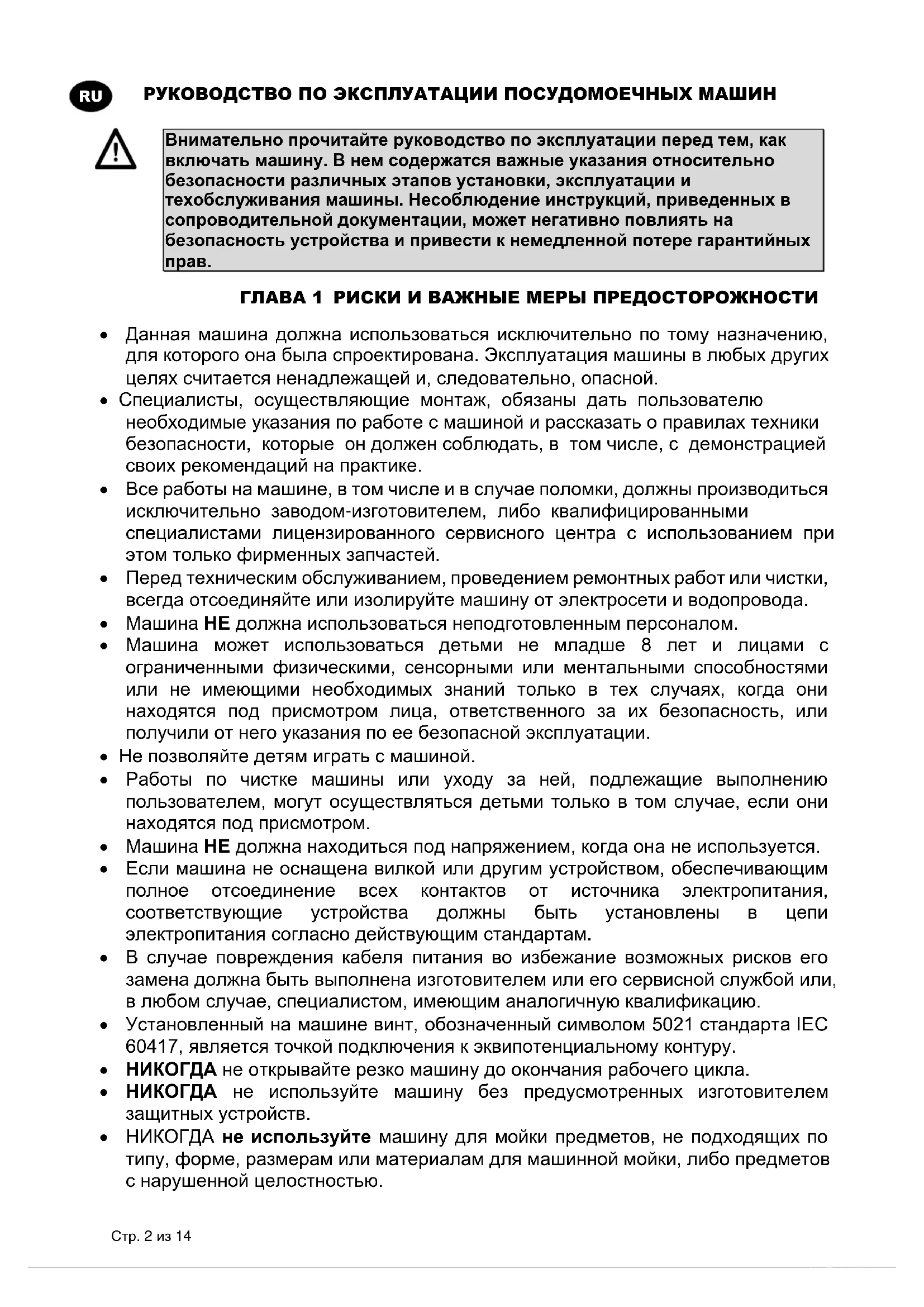 ГЛАВА 1 РИСКИ И ВАЖНЫЕ МЕРЫ ПРЕДОСТОРОЖНОСТИ Данная машина должна использоваться исключительно по тому назначению, для которого она была спроектирована. Эксплуатация машины в любых других целях считается ненадлежащей и, следовательно, опасной. Специалисты, осуществляющие монтаж, обязаны дать пользователю необходимые указания по работе с машиной и рассказать о правилах техники безопасности, которые он должен соблюдать, в том числе, с демонстрацией своих рекомендаций на практике. Все работы на машине, в том числе и в случае поломки, должны производиться исключительно заводом-изготовителем, либо квалифицированными специалистами лицензированного сервисного центра с использованием при этом только фирменных запчастей. Перед техническим обслуживанием, проведением ремонтных работ или чистки, всегда отсоединяйте или изолируйте машину от электросети и водопровода. Машина НЕ должна использоваться неподготовленным персоналом. Машина может использоваться детьми не младше 8 лет и лицами с ограниченными физическими, сенсорными или ментальными способностями или не имеющими необходимых знаний только в тех случаях, когда они находятся под присмотром лица, ответственного за их безопасность, или получили от него указания по ее безопасной эксплуатации. Не позволяйте детям играть с машиной. Работы по чистке машины или уходу за ней, подлежащие выполнению пользователем, могут осуществляться детьми только в том случае, если они находятся под присмотром. Машина НЕ должна находиться под напряжением, когда она не используется. Если машина не оснащена вилкой или другим устройством, обеспечивающим полное отсоединение всех контактов от источника электропитания, соответствующие устройства должны быть установлены в цепи электропитания согласно действующим стандартам. В случае повреждения кабеля питания во избежание возможных рисков его замена должна быть выполнена изготовителем или его сервисной службой или, в любом случае, специалистом, имеющим аналогичную квалификацию. Установленный на машине винт, обозначенный символом 5021 стандарта IEC 60417, является точкой подключения к эквипотенциальному контуру. НИКОГДА не открывайте резко машину до окончания рабочего цикла. НИКОГДА не используйте машину без предусмотренных изготовителем защитных устройств. НИКОГДА не используйте машину для мойки предметов, не подходящих по типу, форме, размерам или материалам для машинной мойки, либо предметов с нарушенной целостностью.РУКОВОДСТВО ПО ЭКСПЛУАТАЦИИ ПОСУДОМОЕЧНЫХ МАШИН Стр. 3 из 14
