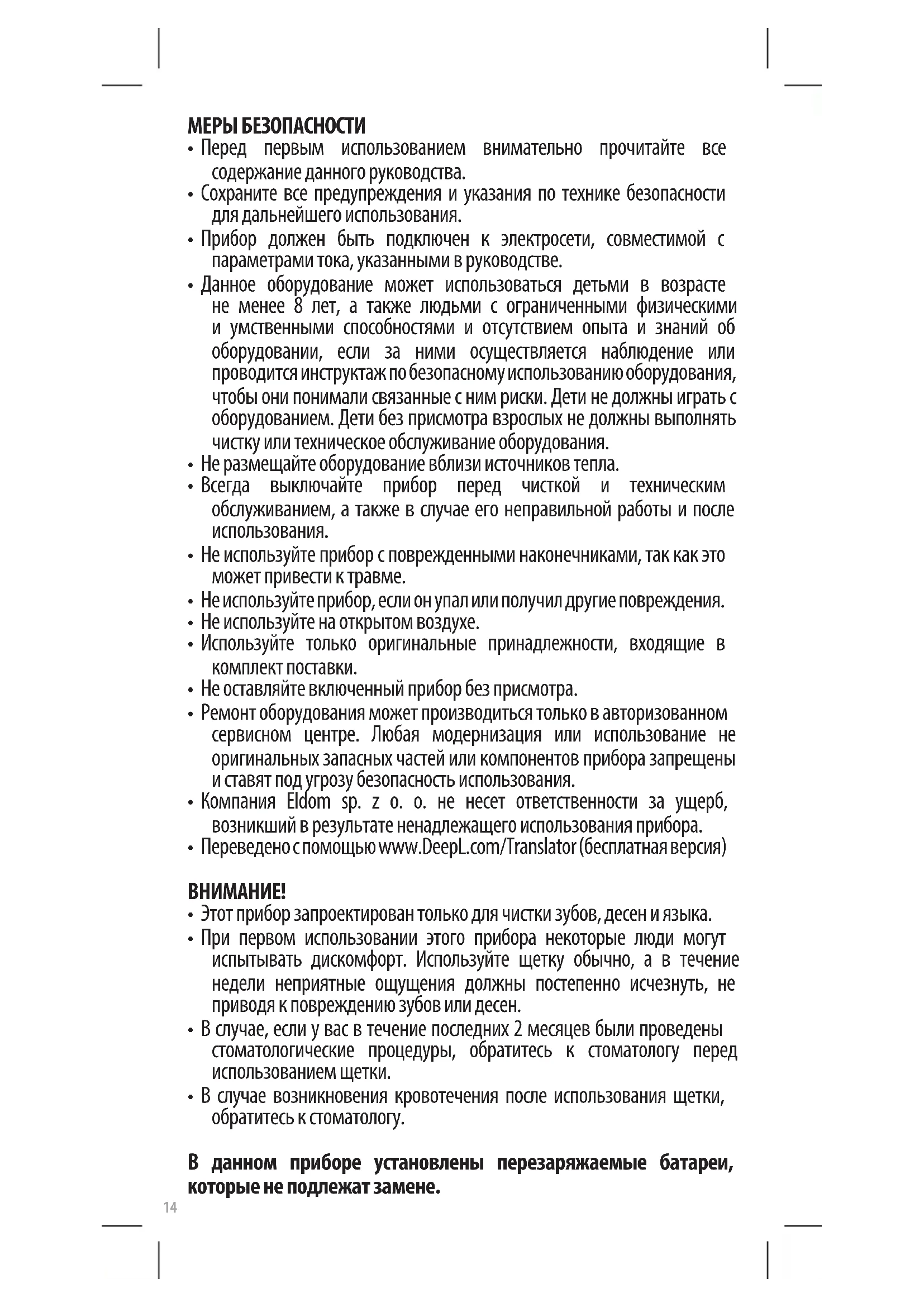 - В случае возникновения кровотечения после использования щетки, обратитесь к стоматологу. В данном приборе установлены перезаряжаемые батареи, которые не подлежат замене.15