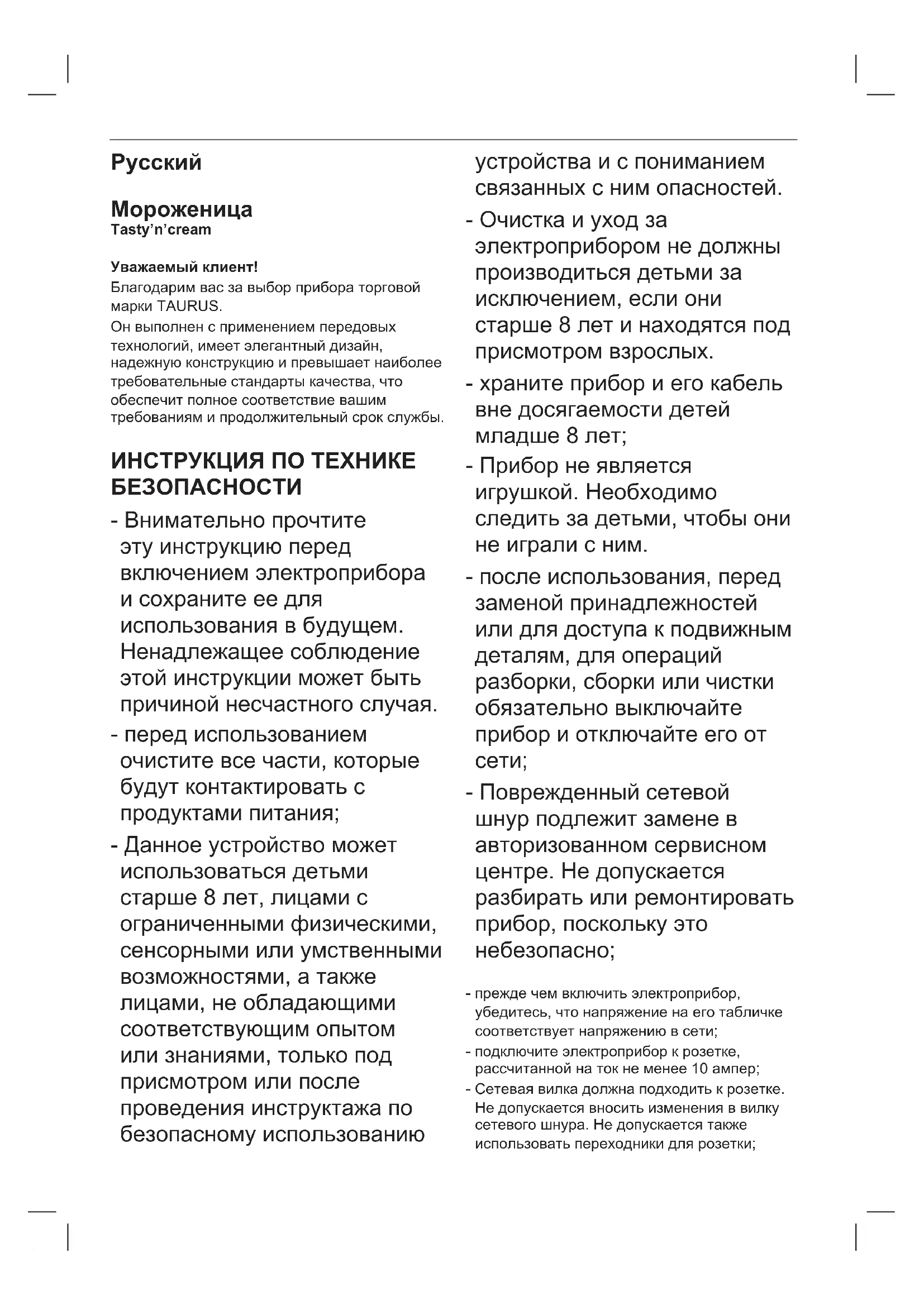 Tasty’n’cream Уважаемый клиент! Благодарим вас за выбор прибора торговой марки TAURUS. Он выполнен с применением передовых технологий, имеет элегантный дизайн, надежную конструкцию и превышает наиболее требовательные стандарты качества, что обеспечит полное соответствие вашим требованиям и продолжительный срок службы. ИНСТРУКЦИЯ ПО ТЕХНИКЕ БЕЗОПАСНОСТИ - Внимательно прочтите эту инструкцию перед включением электроприбора и сохраните ее для использования в будущем. Ненадлежащее соблюдение этой инструкции может быть причиной несчастного случая. - перед использованием очистите все части, которые будут контактировать с продуктами питания; - Данное устройство может использоваться детьми старше 8 лет, лицами с ограниченными физическими, сенсорными или умственными возможностями, а также лицами, не обладающими соответствующим опытом или знаниями, только под присмотром или после проведения инструктажа по безопасному использованию устройства и с пониманием связанных с ним опасностей. - Очистка и уход за электроприбором не должны производиться детьми за исключением, если они старше 8 лет и находятся под присмотром взрослых. - храните прибор и его кабель вне досягаемости детей младше 8 лет; - Прибор не является игрушкой. Необходимо следить за детьми, чтобы они не играли с ним. - после использования, перед заменой принадлежностей или для доступа к подвижным деталям, для операций разборки, сборки или чистки обязательно выключайте прибор и отключайте его от
