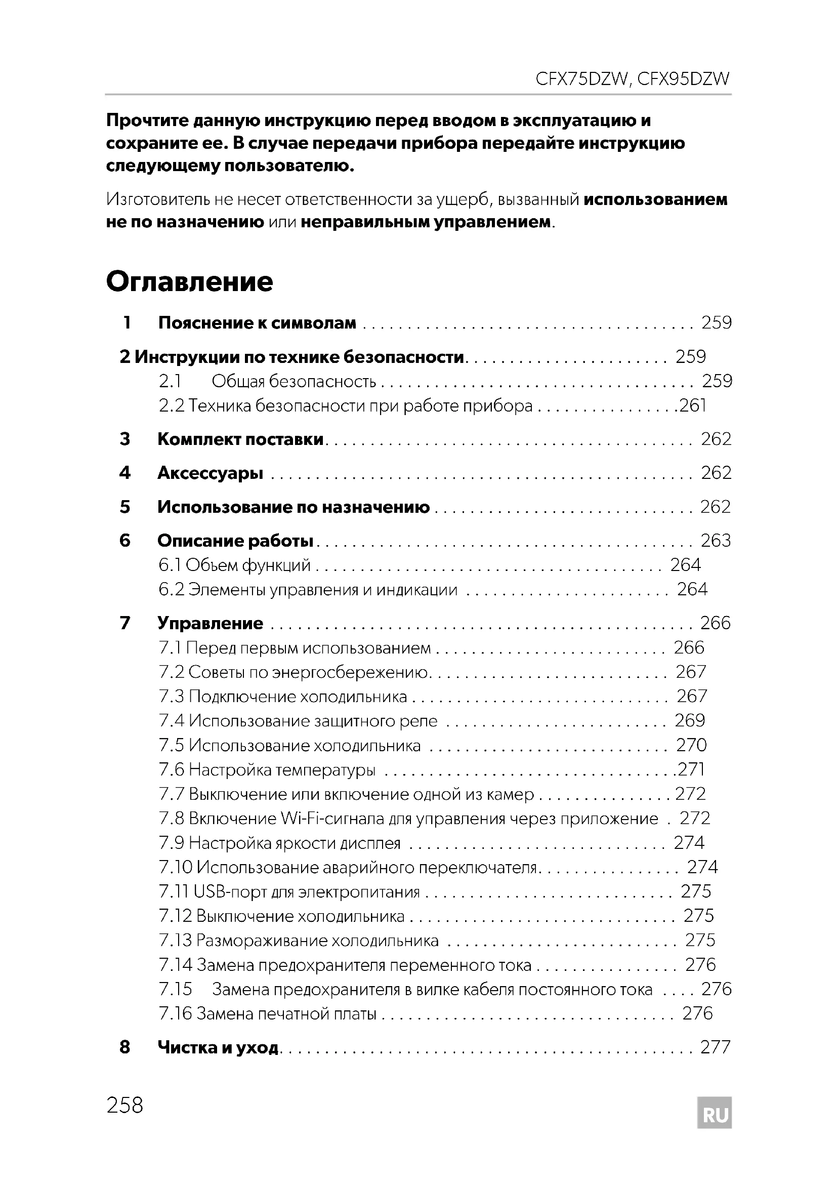 - Не вытаскивайте штекер из розетки за питающий кабель. CFX75_95DZW--O-16s.book Seite 260 Montag, 14. August 2017 4:29 16RU CFX75DZW, CFX95DZW Инструкции по технике безопасности