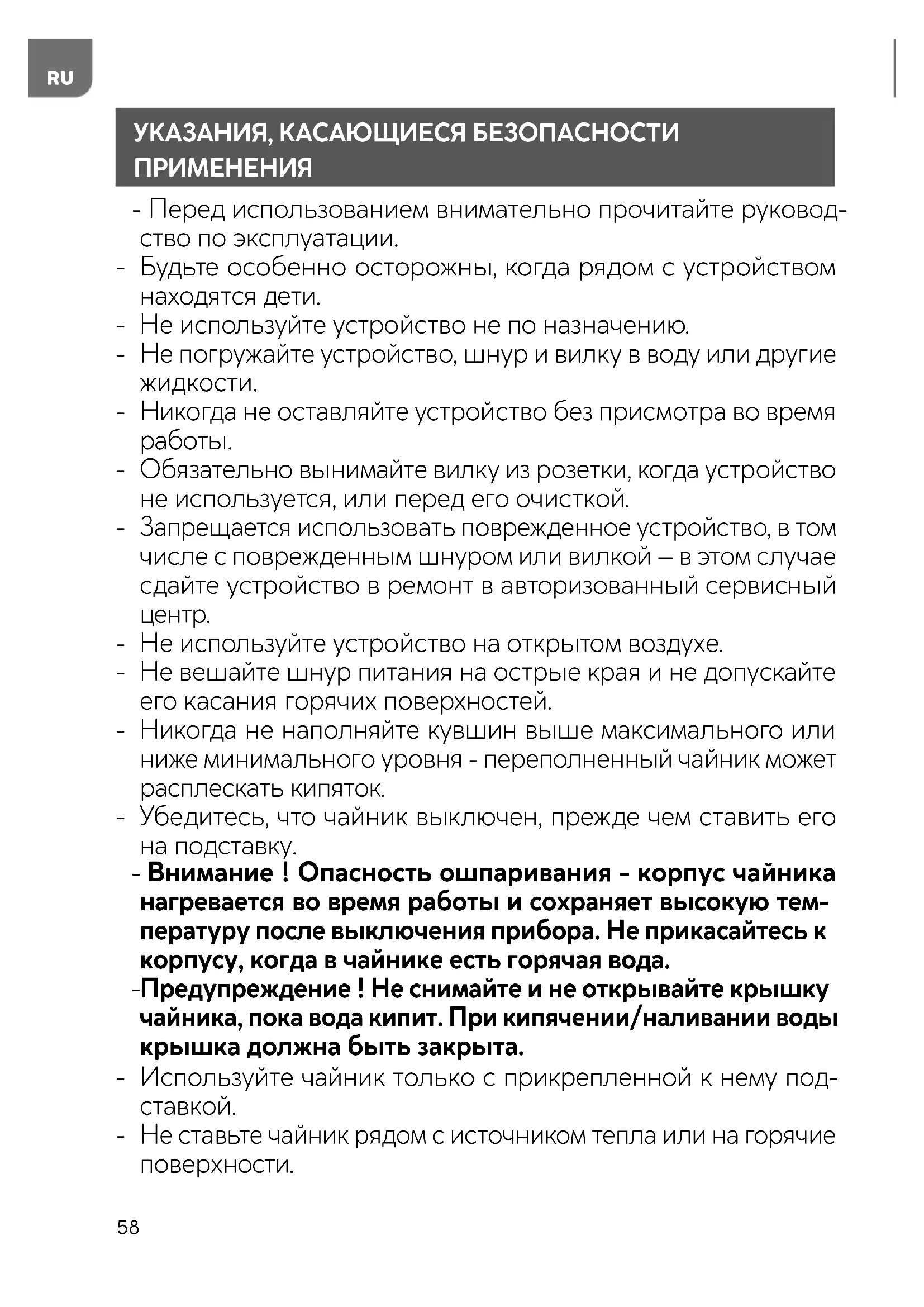 Внимание ! Опасность ошпаривания - корпус чайника нагревается во время работы и сохраняет высокую тем- пературу после выключения прибора. Не прикасайтесь к корпусу, когда в чайнике есть горячая вода.