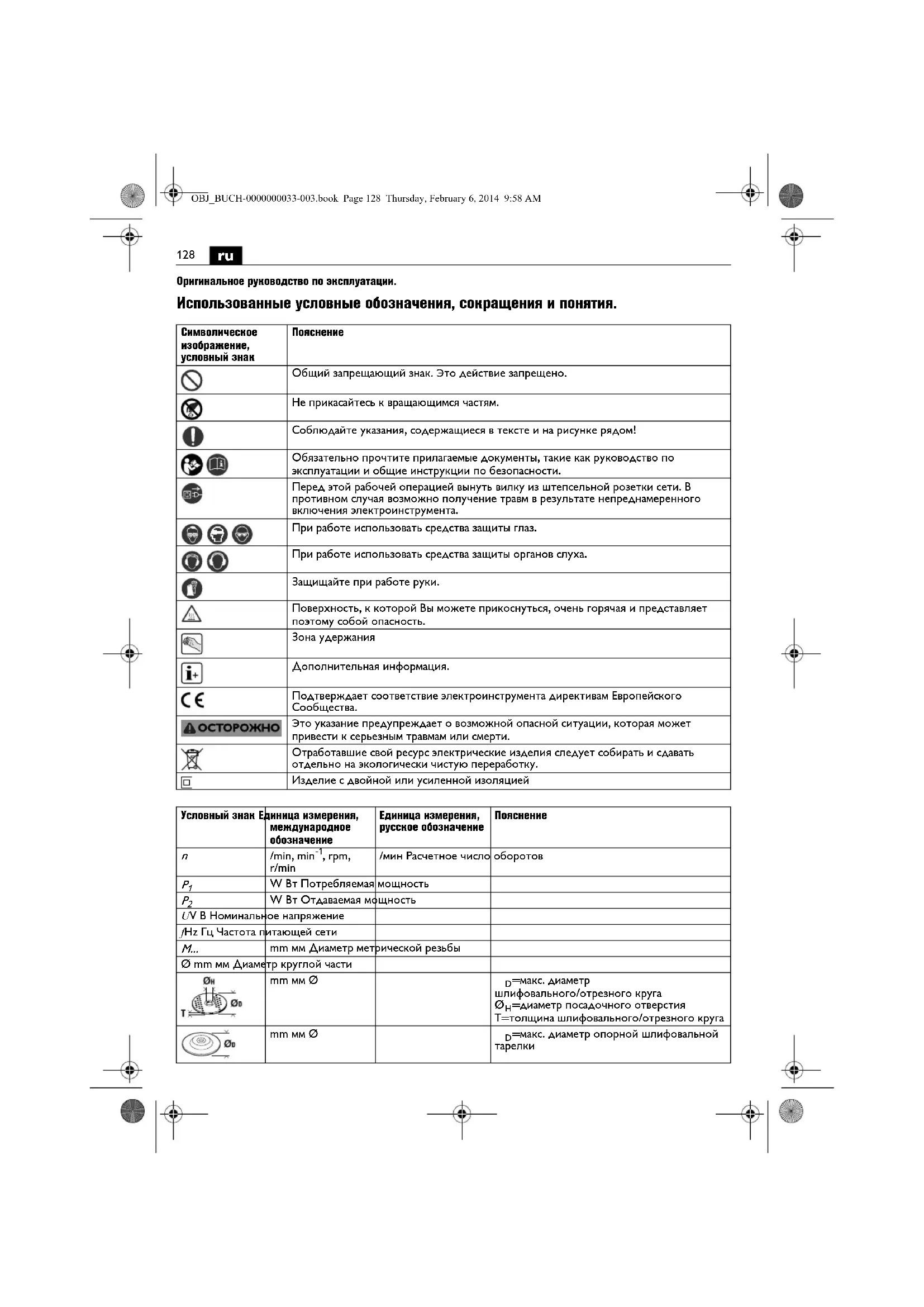 Общий запрещающий знак. Это действие запрещено. Не прикасайтесь к вращающимся частям. Соблюдайте указания, содержащиеся в тексте и на рисунке рядом! Обязательно прочтите прилагаемые документы, такие как руководство по эксплуатации и общие инструкции по безопасности. Перед этой рабочей операцией вынуть вилку из штепсельной розетки сети. В противном случая возможно получение травм в результате непреднамеренного включения электроинструмента. При работе использовать средства защиты глаз. При работе использовать средства защиты органов слуха. Защищайте при работе руки. Поверхность, к которой Вы можете прикоснуться, очень горячая и представляет поэтому собой опасность. Зона удержания Дополнительная информация. Подтверждает соответствие электроинструмента директивам Европейского Сообщества. Это указание предупреждает о возможной опасной ситуации, которая может привести к серьезным травмам или смерти. Отработавшие свой ресурс электрические изделия следует собирать и сдавать отдельно на экологически чистую переработку. Изделие с двойной или усиленной изоляцией Условный знак Eдиница измерения, международное обозначение Eдиница измерения, русское обозначение