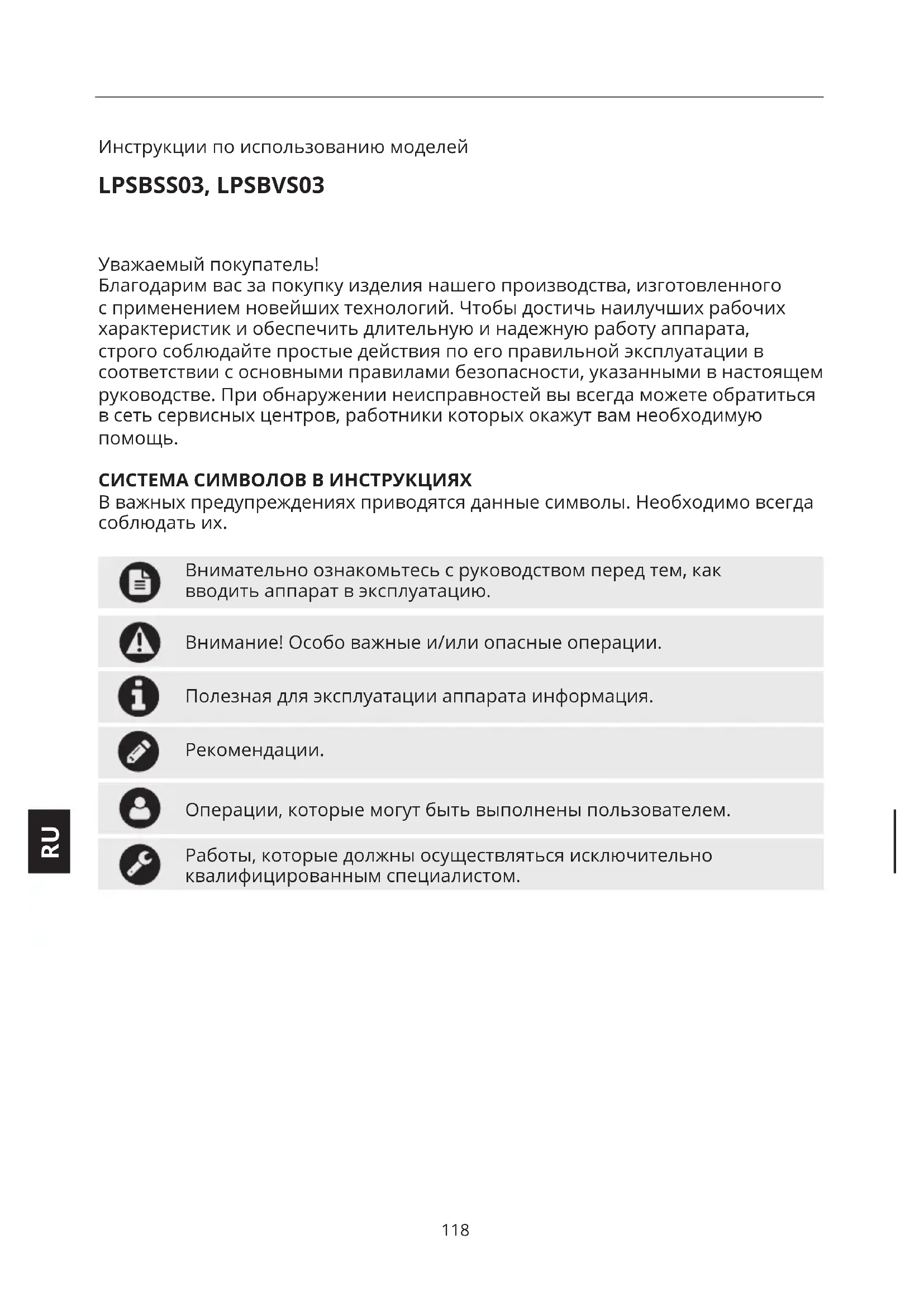 Инструкции по использованию моделей LPSBSS03, LPSBVS03 Уважаемый покупатель! Благодарим вас за покупку изделия нашего производства, изготовленного с применением новейших технологий. Чтобы достичь наилучших рабочих характеристик и обеспечить длительную и надежную работу аппарата, строго соблюдайте простые действия по его правильной эксплуатации в соответствии с основными правилами безопасности, указанными в настоящем руководстве. При обнаружении неисправностей вы всегда можете обратиться в сеть сервисных центров, работники которых окажут вам необходимую