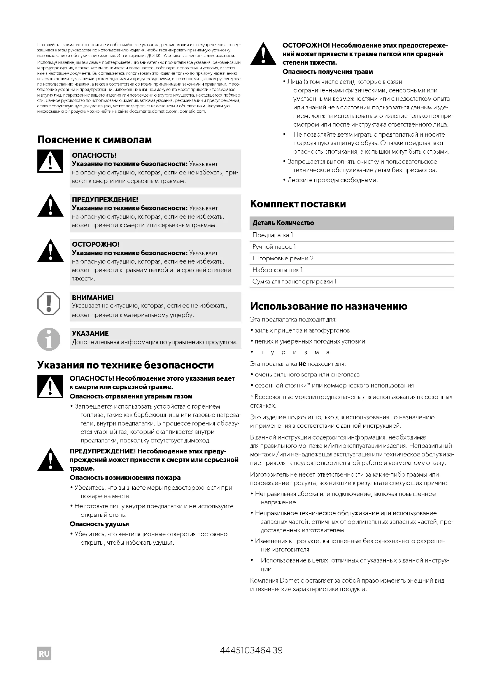 Дополнительная информация по управлению продуктом. Деталь Количество Предпалатка 1 Ручной насос 1 Штормовые ремни 2 Набор колышек 1 Сумка для транспортировки 1 DometicSunshineAirPro300-500_IOM_4445103464_EMEA16_xxxx-xx-xx.book Seite 39 Donnerstag, 30. September 2021 3:10 15RU