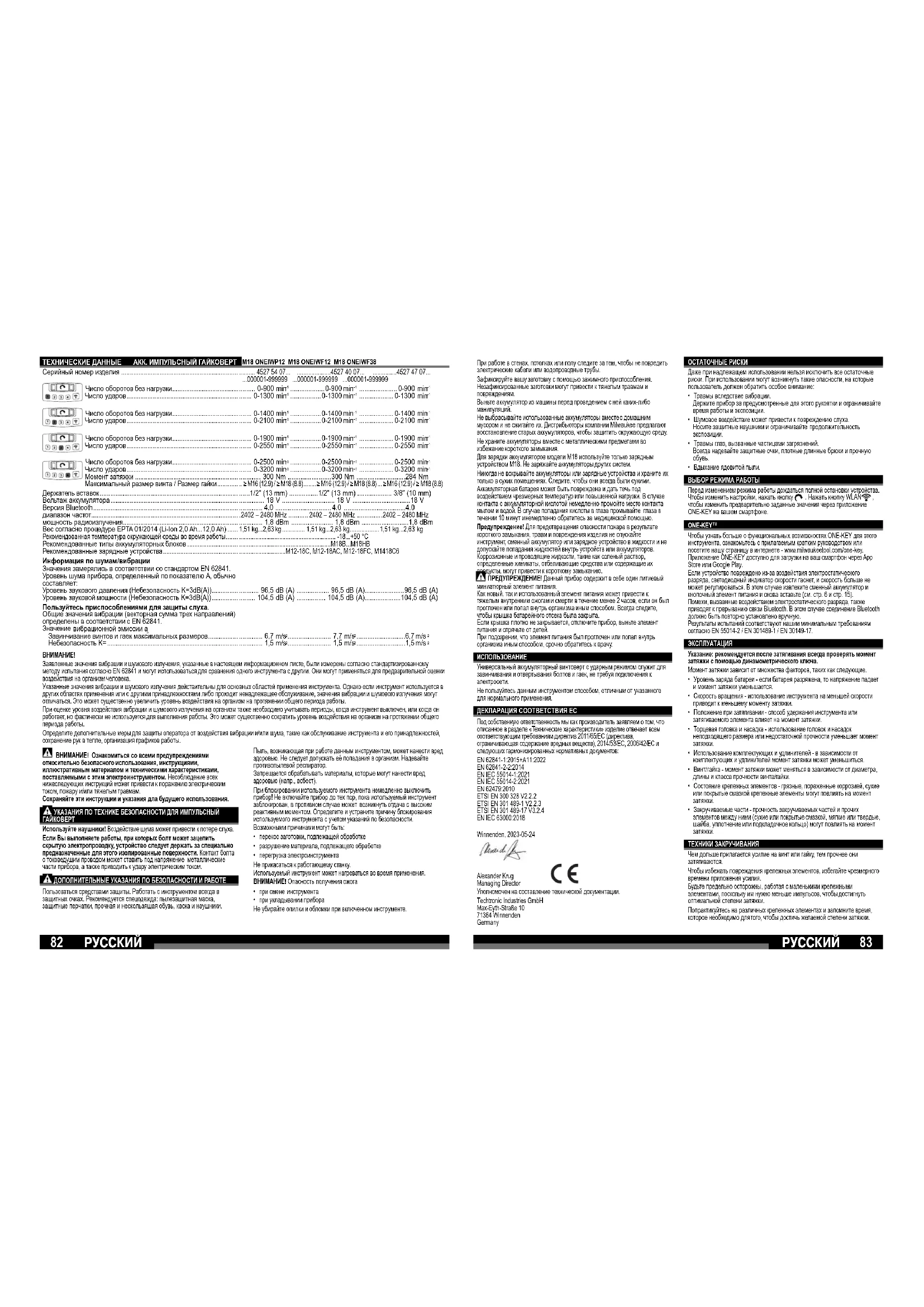 ТЕХНИКИ ЗАКРУЧИВАНИЯ Чем дольше прилагается усилие на винт или гайку, тем прочнее они затягиваются. Чтобы избежать повреждения крепежных элементов, избегайте чрезмерного времени приложения усилия. Будьте предельно осторожны, работая с маленькими крепежными элементами, поскольку им нужно меньше импульсов, чтобы достигнуть оптимальной степени затяжки. Попрактикуйтесь на различных крепежных элементах и запомните время, которое необходимо для того, чтобы достичь желаемой степени затяжки. ÐÓÑÑÊÈÉÐÓÑÑÊÈÉ ТЕХНИЧЕСКИЕ ДАННЫЕ АКК. ИМПУЛЬСНЫЙ ГАЙКОВЕРТ Серийный номер изделия ................................................................... Число оборотов без нагрузки ...................................... Число ударов ................................................................ Число оборотов без нагрузки ...................................... Число ударов ................................................................ Число оборотов без нагрузки ...................................... Число ударов ................................................................ Число оборотов без нагрузки ...................................... Число ударов ................................................................ Момент затяжки ........................................................... Максимальный размер винта / Размер гайки ............ Держатель вставок ............................................................................... Bольтаж аккумулятора ......................................................................... Версия Bluetooth ................................................................................... диапазон частот .................................................................................... мощность радиоизлучения.................................................................. Вес согласно процедуре EPTA 01/2014 (Li-Ion 2,0 Ah...12,0 Ah) ...... Рекомендованная температура окружающей среды во время работы
