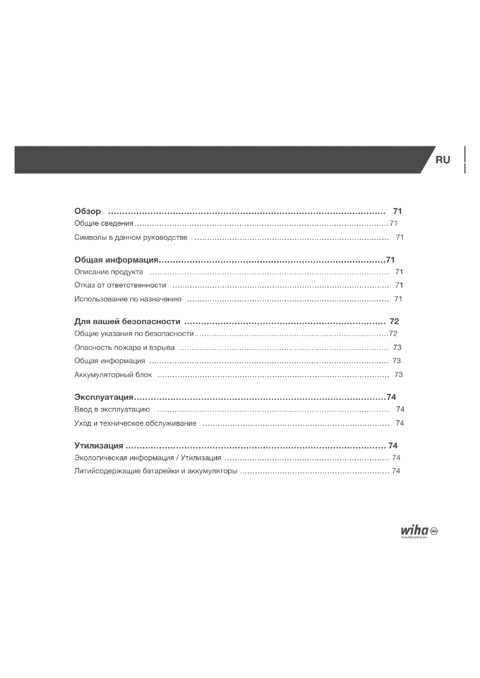 A termék megfelel az EU irányelvek követelményeinek. A műszaki változtatások joga fenntartva. Nyomdai hibákért nem vállalunk felelősséget.RUОГЛАВЛЕНИЕ Обзор ……………………………………………………………………………………… 71 Общие сведения ………………………………………………………………………………………… 71 Символы в данном руководстве …………………………………………………………………… 71 Общая информация ……………………………………………………………………… 71 Описание продукта …………………………………………………………………………………… 71 Отказ от ответственности …………………………………………………………………………… 71 Использование по назначению ……………………………………………………………………… 71 Для вашей безопасности ……………………………………………………………… 72 Общие указания по безопасности …………………………………………………………………… 72 Опасность пожара и взрыва ………………………………………………………………………… 73 Общая информация …………………………………………………………………………………… 73 Аккумуляторный блок ………………………………………………………………………………… 73 Эксплуатация ……………………………………………………………………………… 74 Ввод в эксплуатацию ………………………………………………………………………………… 74 Уход и техническое обслуживание ………………………………………………………………… 74 Утилизация ………………………………………………………………………………… 74 Экологическая информация / Утилизация ………………………………………………………… 74 Литийсодержащие батарейки и аккумуляторы …………………………………………………… 74RU