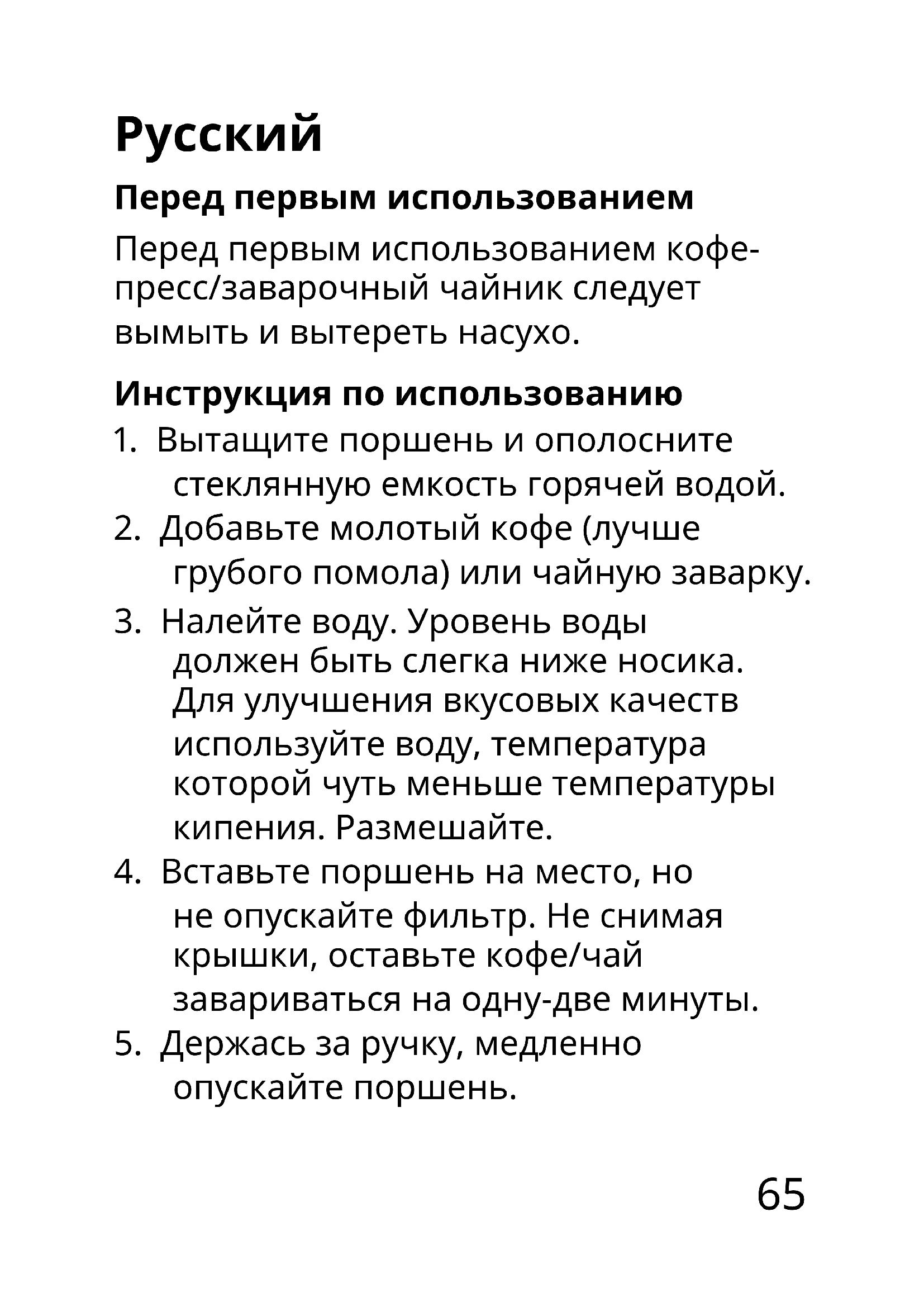 Передпервымиспользованием Перед первым использованием кофе- пресс/заварочный чайник следует вымыть и вытереть насухо. Инструкцияпоиспользованию