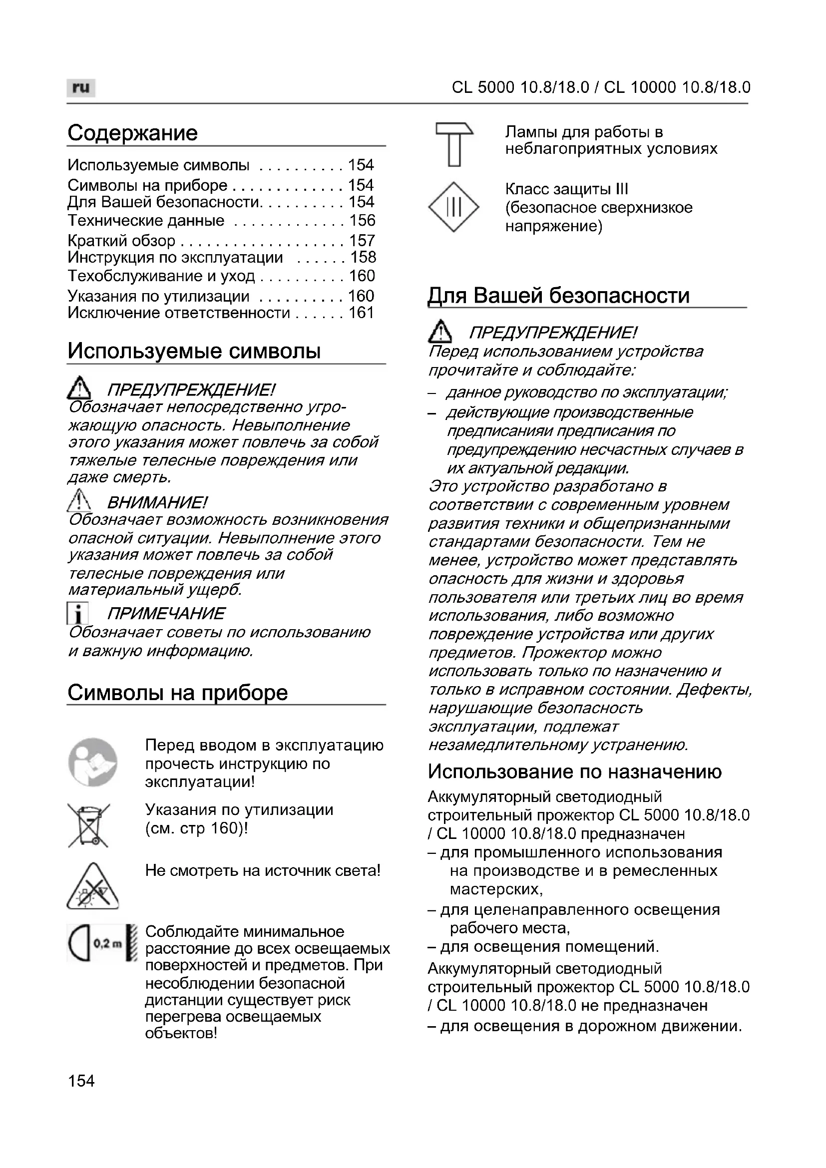 устройство может представлять опасность для жизни и здоровья пользователя или третьих лиц во время использования, либо возможно повреждение устройства или других предметов. Прожектор можно использовать только по назначению и только в исправном состоянии. Дефекты, нарушающие безопасность эксплуатации, подлежат незамедлительному устранению. Использование по назначению Аккумуляторный светодиодный строительный прожектор CL 5000 10.8/18.0 / CL 10000 10.8/18.0 предназначен – для промышленного использования на производстве и в ремесленных мастерских, – для целенаправленного освещения рабочего места, – для освещения помещений. Аккумуляторный светодиодный строительный прожектор CL 5000 10.8/18.0 / CL 10000 10.8/18.0 не предназначен – для освещения в дорожном движении. Перед вводом в эксплуатацию прочесть инструкцию по эксплуатации! Указания по утилизации (см. стр 160)! Не смотреть на источник света! Соблюдайте минимальное расстояние до всех освещаемых поверхностей и предметов. При несоблюдении безопасной дистанции существует риск перегрева освещаемых