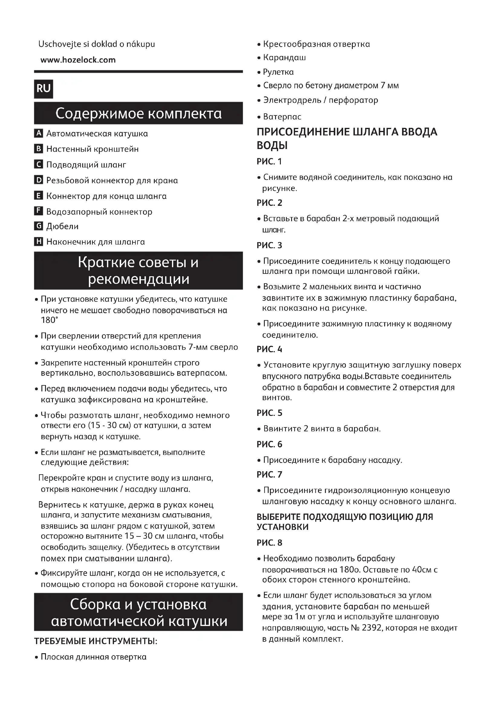 РУКОВОДСТВО ПОЛЬЗОВАТЕЛЯ Auto Reel 10m HOZELOCK