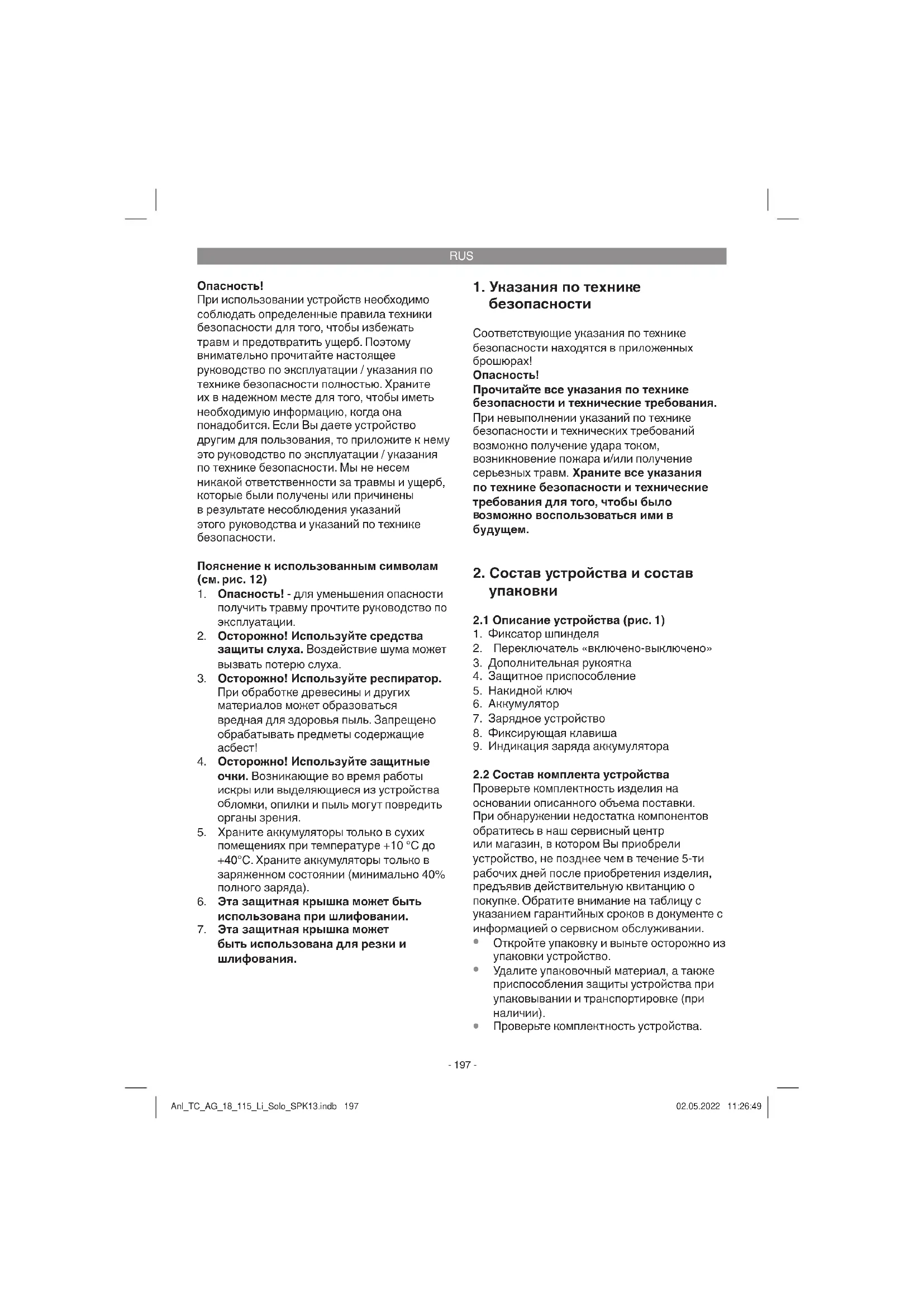 лектрическоґо устройства в случае избавления от собственности обязан,в качестве альтернативы отсылки назад изґотовителю, содействовать надлежащей утилизации. Пришедшее в неґодность устройство может быть передано в приемный пункт, который осуществит ликвидацию в соответствии с законом страны о цикличном производстве и обращении с мусором. Это не относится к приложенным к пришедшему в неґодность оборудованию дополнительным устройствам и вспомоґательным средствам, не содержащим электрические части. При утилизации устройства убедитесь, что из него извлечены аккумуляторы и осветительные приборы (например, лампочки). Перепечатывание или прочие виды размножения документации и сопроводительных листов продукции фирмы, полностью или частично, разрешено производить только с однозначного разрешения Einhell Germany AG. Сохpaняeтcя прaво на тeхничeскиe изменения Anl_TC_AG_18_115_Li_Solo_SPK13.indb 204Anl_TC_AG_18_115_Li_Solo_SPK13.indb 204 02.05.2022 11:26:5002.05.2022 11:26:50RUS