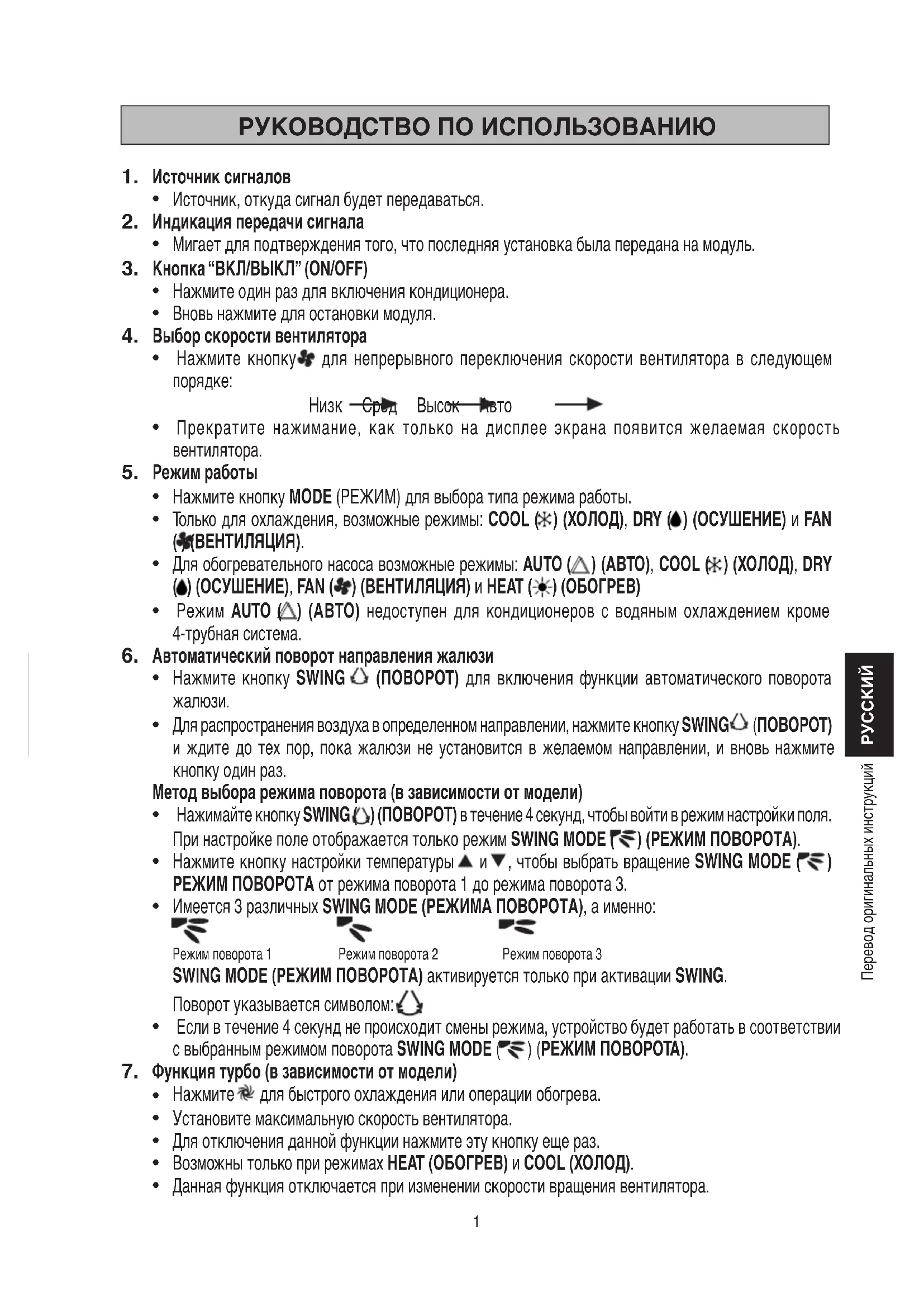 Для распространения воздуха в определенном направлении, нажмите кнопку SWING (ПОВОРОТ) и ждите до тех пор, пока жалюзи не установится в желаемом направлении, и вновь нажмите кнопку один раз. Метод выбора режима поворота (в зависимости от модели) Нажимайте кнопку SWING ( ) (ПОВОРОТ) в течение 4 секунд, чтобы войти в режим настройки поля. При настройке поле отображается только режим SWING MODE ( ) (РЕЖИМ ПОВОРОТА). Нажмите кнопку настройки температуры и , чтобы выбрать вращение SWING MODE ( ) РЕЖИМ ПОВОРОТА от режима поворота 1 до режима поворота 3. Имеется 3 различных SWING MODE (РЕЖИМА ПОВОРОТА), а именно: Режим поворота 1 Режим поворота 2 Режим поворота 3 SWING MODE (РЕЖИМ ПОВОРОТА) активируется только при активации SWING. Поворот указывается символом: Если в течение 4 секунд не происходит смены режима, устройство будет работать в соответствии с выбранным режимом поворота SWING MODE ( ) (РЕЖИМ ПОВОРОТА). Функция турбо (в зависимости от модели) Нажмите для быстрого охлаждения или операции обогрева. Установите максимальную скорость вентилятора. Для отключения данной функции нажмите эту кнопку еще раз. Возможны только при режимах HEAT (ОБОГРЕВ) и COOL (ХОЛОД). Данная функция отключается при изменении скорости вращения вентилятора.