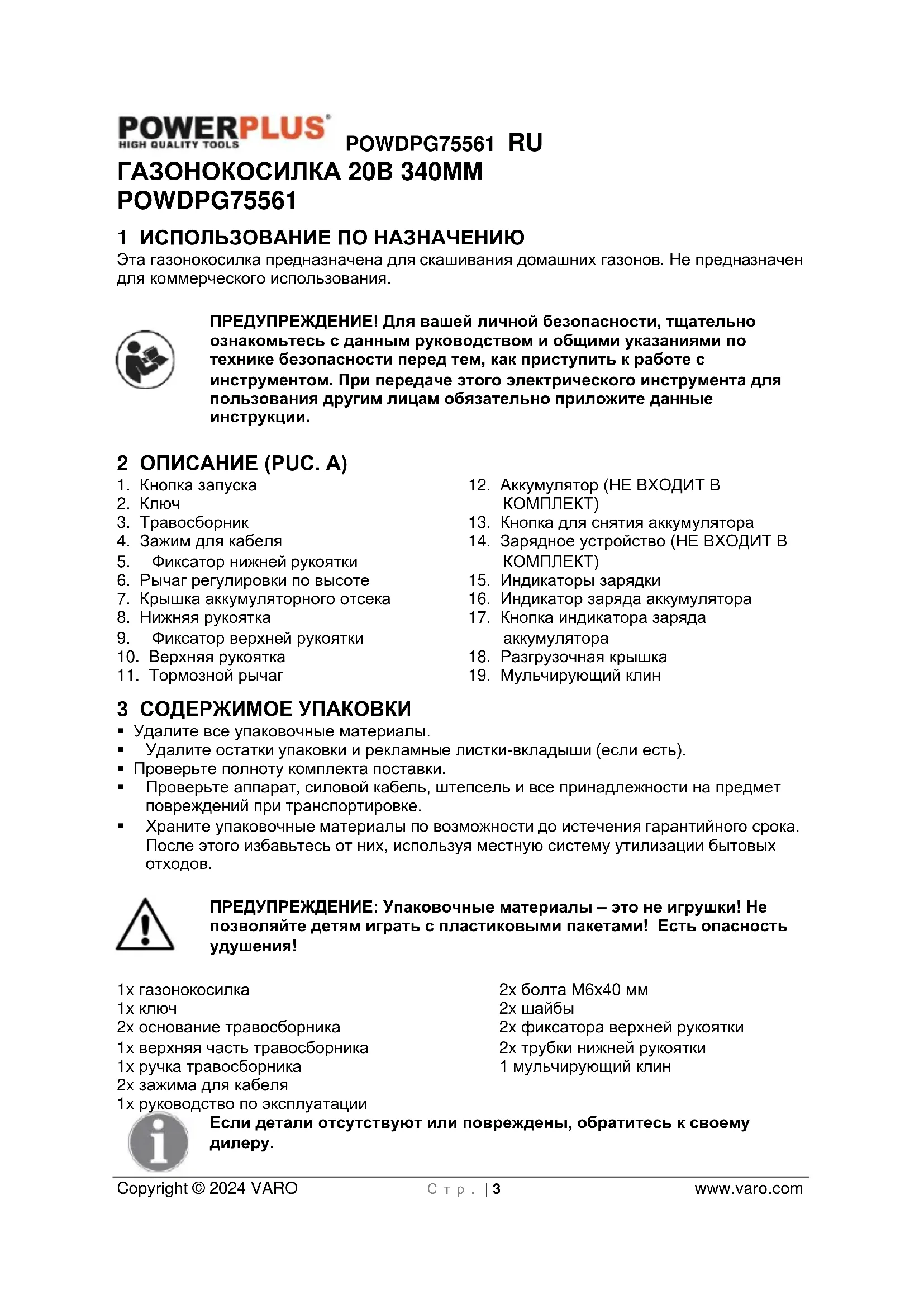 - 16 ДЕКЛАРАЦИЯ О СООТВЕТСТВИИ POWDPG75561 RU Copyright © 2024 VARO С т р . | 3 www.varo.com ГАЗОНОКОСИЛКА 20B 340ММ POWDPG75561 1 ИСПОЛЬЗОВАНИЕ ПО НАЗНАЧЕНИЮ Эта газонокосилка предназначена для скашивания домашних газонов. Не предназначен для коммерческого использования. ПРЕДУПРЕЖДЕНИЕ! Для вашей личной безопасности, тщательно ознакомьтесь с данным руководством и общими указаниями по технике безопасности перед тем, как приступить к работе с инструментом. При передаче этого электрического инструмента для пользования другим лицам обязательно приложите данные инструкции. 2 ОПИСАНИЕ (РUС. A) p. 16