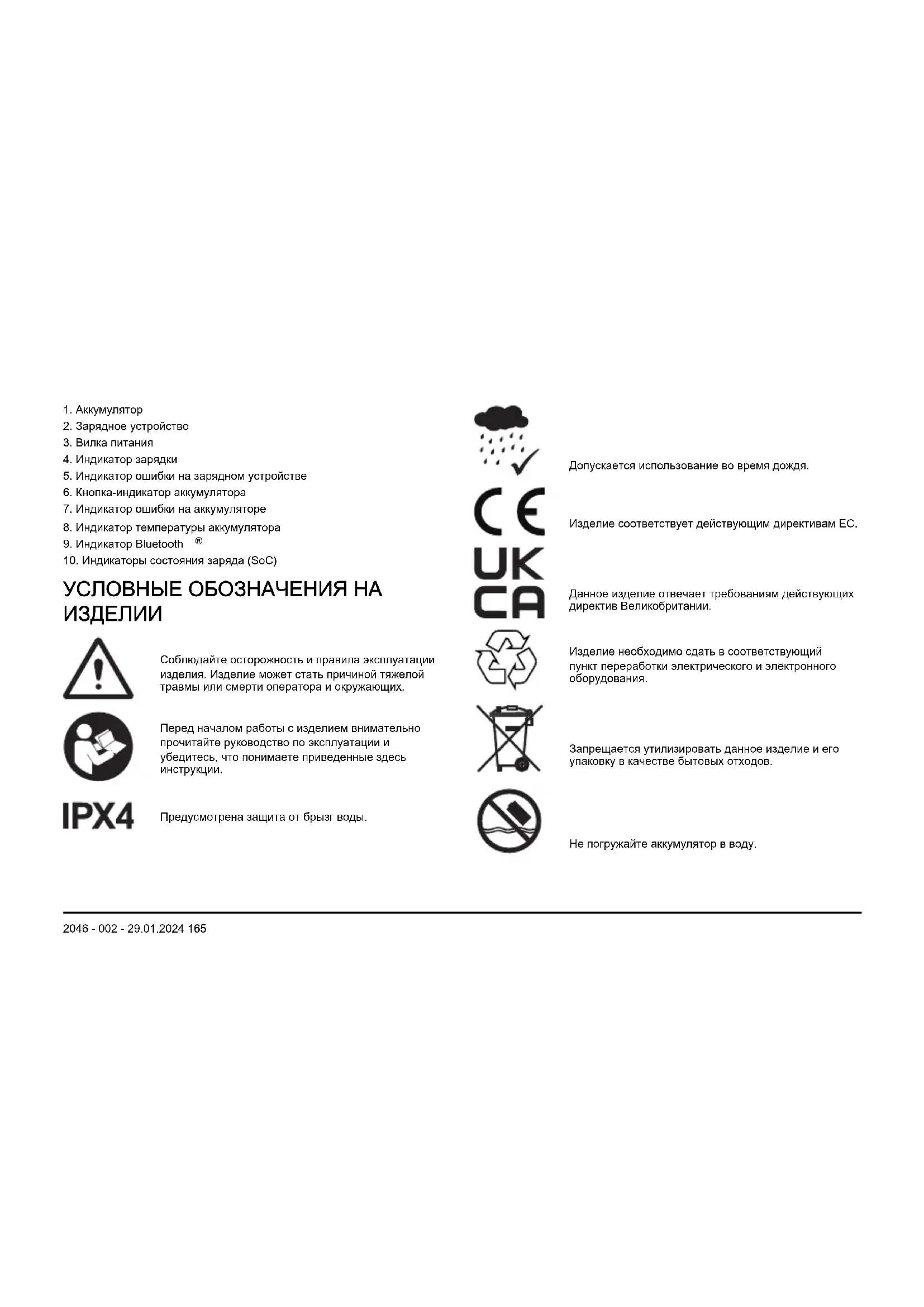 Соблюдайте осторожность и правила эксплуатации изделия. Изделие может стать причиной тяжелой травмы или смерти оператора и окружающих. Перед началом работы с изделием внимательно прочитайте руководство по эксплуатации и убедитесь, что понимаете приведенные здесь инструкции. Предусмотрена защита от брызг воды. Допускается использование во время дождя. Изделие соответствует действующим директивам EC. Данное изделие отвечает требованиям действующих директив Великобритании. Изделие необходимо сдать в соответствующий пункт переработки электрического и электронного оборудования. Запрещается утилизировать данное изделие и его упаковку в качестве бытовых отходов. Не погружайте аккумулятор в воду. 2046 - 002 - 29.01.2024 165Если изделие поддерживает технологию беспроводной связи Bluetooth
