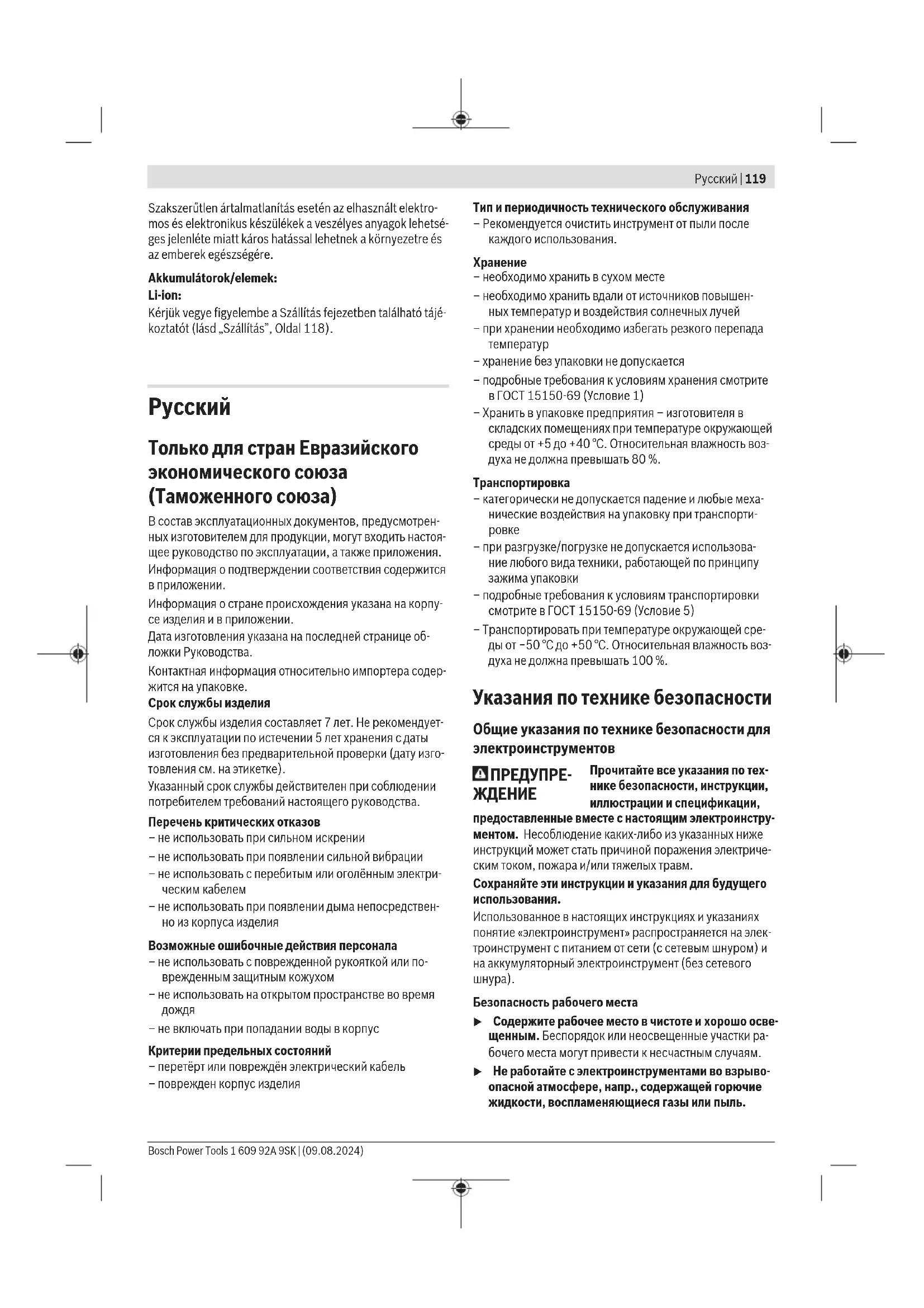Уполномоченная изготовителем организация: ООО «Роберт Бош» Вашутинское шоссе, вл. 24 141400, г. Химки, Московская обл. Тел.: +7 800 100 8007 E-Mail: info.powertools@ru.bosch.com www.bosch-pt.ru Прочие сервисные адреса находятся на: www.bosch-pt.com/serviceaddresses В случае выхода электроинструмента из строя в течение гарантийного срока эксплуатации по вине изготовителя, владелец имеет право на бесплатный гарантийный ре- монт, при соблюдении следующих условий: – отсутствие механических повреждений; – отсутствие признаков нарушения требований руко- водства по эксплуатации – наличие в руководстве по эксплуатации отметки про- давца о продаже и подписи покупателя; – соответствие серийного номера электроинструмента и серийному номеру в гарантийном талоне; – отсутствие следов неквалифицированного ремонта. Гарантия не распространяется на: – любые поломки, связанные с форс-мажорными обсто- ятельствами; – нормальный износ: электроинструмента, так же, как и все электрические. Гарантией не покрывается ремонт, потребность в кото- ром возникает вследствие нормального износа, сокра- щающего срок службы таких частей инструмента, как присоединительные контакты, провода, щётки и т.п.: – естественный износ (полная выработка ресурса); – оборудование и его части, выход из строя которых стал следствием неправильной установки, несанкцио- нированной модификации, неправильного примене- ния, нарушение правил обслуживания или хранения; – неисправности, возникшие в результате перегрузки электроинструмента. (К безусловным признакам пере- грузки инструмента относятся: появление цвета побе- жалости, деформация или оплавление деталей и узлов электроинструмента, потемнение или обугливание изоляции проводов электродвигателя под действием высокой температуры.) Транспортировка На вложенные литий-ионные аккумуляторные батареи распространяются требования в отношении транспорти- ровки опасных грузов. Аккумуляторные батареи могут перевозиться самим пользователем автомобильным транспортом без необходимости соблюдения дополни- тельных норм. При пересылке третьими лицами (напр.: самолетом или транспортным экспедитором) необходимо соблюдать особые требования к упаковке и маркировке. В этом слу- чае при подготовке груза к отправке необходимо участие эксперта по опасным грузам. Пересылайте аккумуляторную батарею только в том слу- чае, если корпус не поврежден. Заклейте открытые кон- такты и упакуйте аккумуляторную батарею так, чтобы она не болталась в упаковке. Соблюдайте, пожалуйста, также возможные дополнительные национальные предписа-