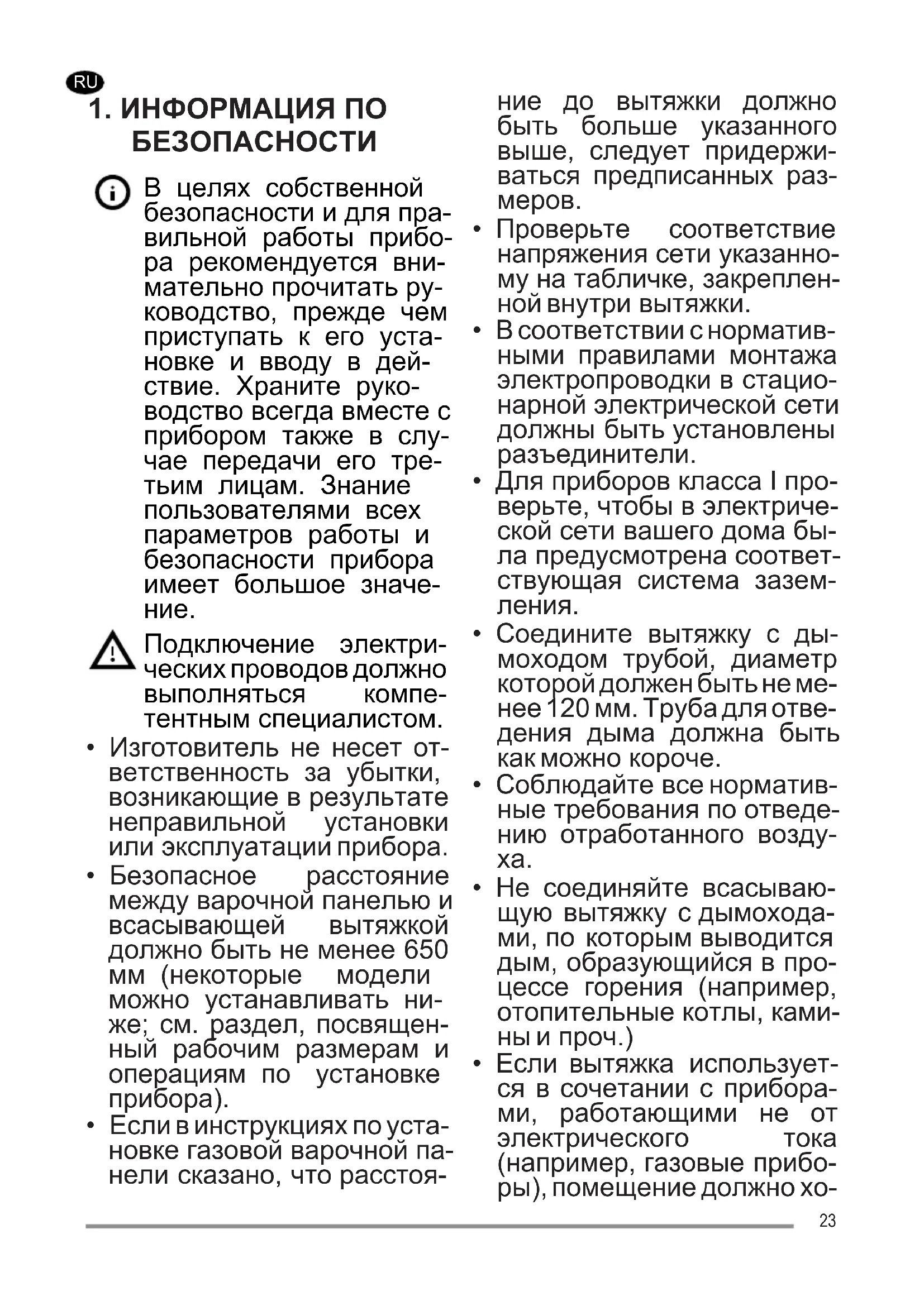 - Если вытяжка использует- ся в сочетании с прибора- ми, работающими не от электрического тока (например, газовые прибо- ры), помещение должно хо- 23рошо проветриваться во из- бежание обратного потока отходящих газов. При поль- зовании кухонной вытяж- кой в сочетании с прибора- ми, работающими не от электрического тока, отри- цательное давление в по- мещении не должно превы- шать 0,04 мбар с тем, чтобы дым не всасывался вытяж- кой обратно в помещение.