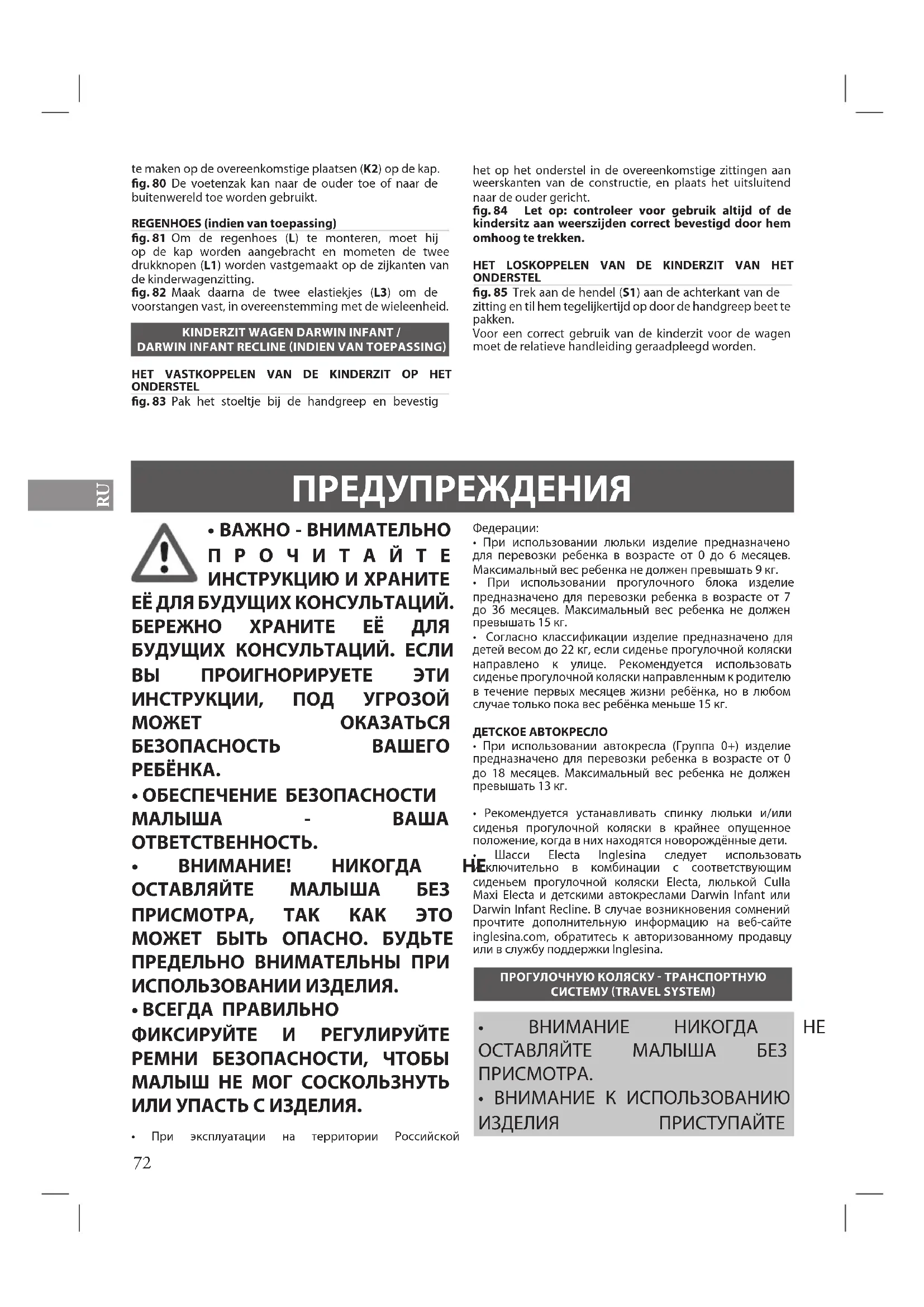- Шасси Electa Inglesina следует использовать исключительно в комбинации с соответствующим сиденьем прогулочной коляски Electa, люлькой Culla Maxi Electa и детскими автокреслами Darwin Infant или Darwin Infant Recline. В случае возникновения сомнений прочтите дополнительную информацию на веб-сайте inglesina.com, обратитесь к авторизованному продавцу или в службу поддержки Inglesina. ПРОГУЛОЧНУЮ КОЛЯСКУ - ТРАНСПОРТНУЮ СИСТЕМУ (TRAVEL SYSTEM)