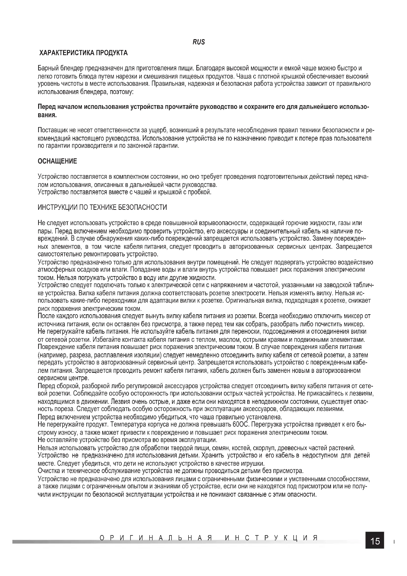 Устройство поставляется в комплектном состоянии, но оно требует проведения подготовительных действий перед нача- лом использования, описанных в дальнейшей части руководства. Устройство поставляется вместе с чашей и крышкой с пробкой. ИНСТРУКЦИИ ПО ТЕХНИКЕ БЕЗОПАСНОСТИ Не следует использовать устройство в среде повышенной взрывоопасности, содержащей горючие жидкости, газы или пары. Перед включением необходимо проверить устройство, его аксессуары и соединительный кабель на наличие по- вреждений. В случае обнаружения каких-либо повреждений запрещается использовать устройство. Замену поврежден- ных элементов, в том числе кабеля питания, следует проводить в авторизованных сервисных центрах. Запрещается самостоятельно ремонтировать устройство. Устройство предназначено только для использования внутри помещений. Не следует подвергать устройство воздействию атмосферных осадков или влаги. Попадание воды и влаги внутрь устройства повышает риск поражения электрическим током. Нельзя погружать устройство в воду или другие жидкости. Устройство следует подключать только к электрической сети с напряжением и частотой, указанными на заводской таблич- ке устройства. Вилка кабеля питания должна соответствовать розетке электросети. Нельзя изменять вилку. Нельзя ис- пользовать какие-либо переходники для адаптации вилки к розетке. Оригинальная вилка, подходящая к розетке, снижает риск поражения электрическим током. После каждого использования следует вынуть вилку кабеля питания из розетки. Всегда необходимо отключить миксер от источника питания, если он оставлен без присмотра, а также перед тем как собрать, разобрать либо почистить миксер. Не перегружайте кабель питания. Не используйте кабель питания для переноски, подсоединения и отсоединения вилки от сетевой розетки. Избегайте контакта кабеля питания с теплом, маслом, острыми краями и подвижными элементами. Повреждение кабеля питания повышает риск поражения электрическим током. В случае повреждения кабеля питания (например, разреза, расплавления изоляции) следует немедленно отсоединить вилку кабеля от сетевой розетки, а затем передать устройство в авторизованный сервисный центр. Запрещается использовать устройство с поврежденным кабе- лем питания. Запрещается проводить ремонт кабеля питания, кабель должен быть заменен новым в авторизованном сервисном центре. Перед сборкой, разборкой либо регулировкой аксессуаров устройства следует отсоединить вилку кабеля питания от сете- вой розетки. Соблюдайте особую осторожность при использовании острых частей устройства. Не прикасайтесь к лезвиям, находящимся в движении. Лезвия очень острые, и даже если они находятся в неподвижном состоянии, существует опас- ность пореза. Следует соблюдать особую осторожность при эксплуатации аксессуаров, обладающих лезвиями. Перед включением устройства необходимо убедиться, что чаша правильно установлена. Не перегружайте продукт. Температура корпуса не должна превышать 60OC. Перегрузка устройства приведет к его бы- строму износу, а также может привести к повреждению и повышает риск поражения электрическим током. Не оставляйте устройство без присмотра во время эксплуатации. Нельзя использовать устройство для обработки твердой пищи, семян, костей, скорлуп, древесных частей растений. Ус