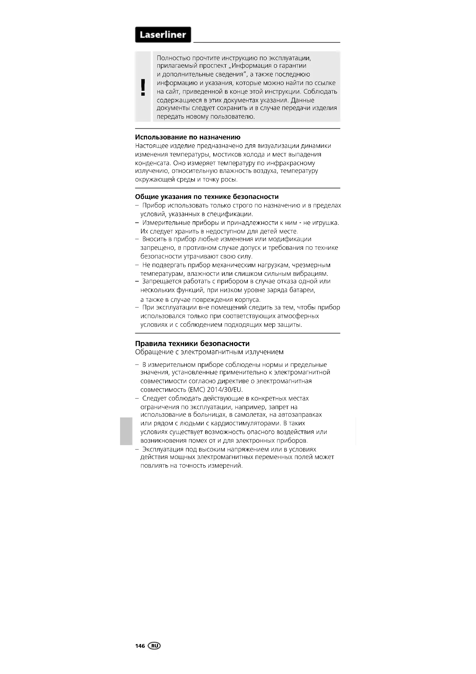 Для обеспечения точности результатов измерений и функциональности следует регулярно проводить калибровку и проверку измерительного прибора. Мы рекомендуем проводить калибровку с периодичностью раз в год. Вы можете получить консультацию по этому вопросу у вашего продавца или сотрудников службы поддержки UMAREX-LASERLINER. Информация по обслуживанию и уходу Все компоненты очищать слегка влажной салфеткой; не использовать чистящие средства, абразивные материалы и растворители. Прибор хранить в чистом и сухом месте.