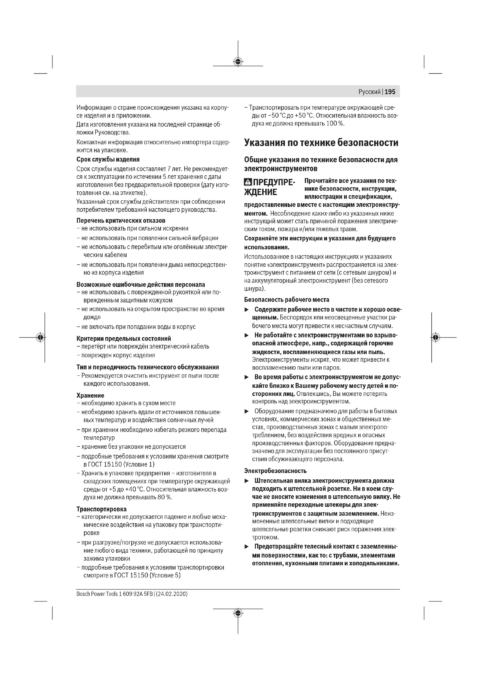 Toлько для стран Евразийского экономического союза (Таможенного союза) В состав эксплуатационных документов, предусмотрен- ных изготовителем для продукции, могут входить настоя- щее руководство по эксплуатации, а также приложения. Информация о подтверждении соответствия содержится в приложении. 1 609 92A 5FB | (24.02.2020) Bosch Power ToolsРусский | 195 Информация о стране происхождения указана на корпу- се изделия и в приложении. Дата изготовления указана на последней странице об- ложки Руководства. Контактная информация относительно импортера содер- жится на упаковке. Срок службы изделия Срок службы изделия составляет 7 лет. Не рекомендует- ся к эксплуатации по истечении 5 лет хранения с даты изготовления без предварительной проверки (дату изго- товления см. на этикетке). Указанный срок службы действителен при соблюдении потребителем требований настоящего руководства. Перечень критических отказов – не использовать при сильном искрении – не использовать при появлении сильной вибрации – не использовать с перебитым или оголённым электри- ческим кабелем – не использовать при появлении дыма непосредствен- но из корпуса изделия Возможные ошибочные действия персонала – не использовать с поврежденной рукояткой или по- врежденным защитным кожухом – не использовать на открытом пространстве во время