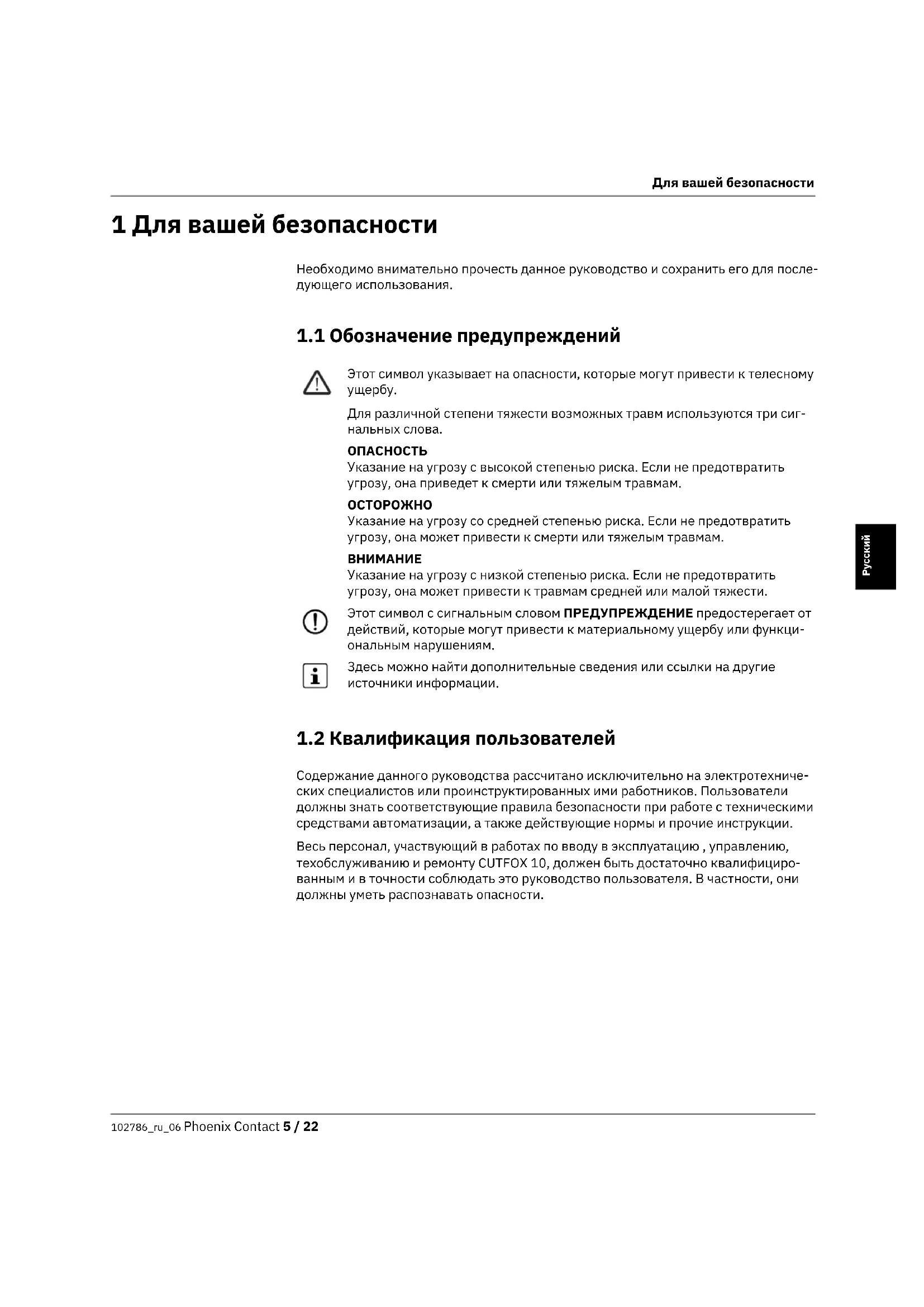 Указание на угрозу с низкой степенью риска. Если не предотвратить угрозу, она может привести к травмам средней или малой тяжести. Этот символ с сигнальным словом ПРЕДУПРЕЖДЕНИЕ предостерегает от действий, которые могут привести к материальному ущербу или функци- ональным нарушениям. Здесь можно найти дополнительные сведения или ссылки на другие источники информации.CUTFOX 10 6 / 22 Phoenix Contact 102786_ru_06