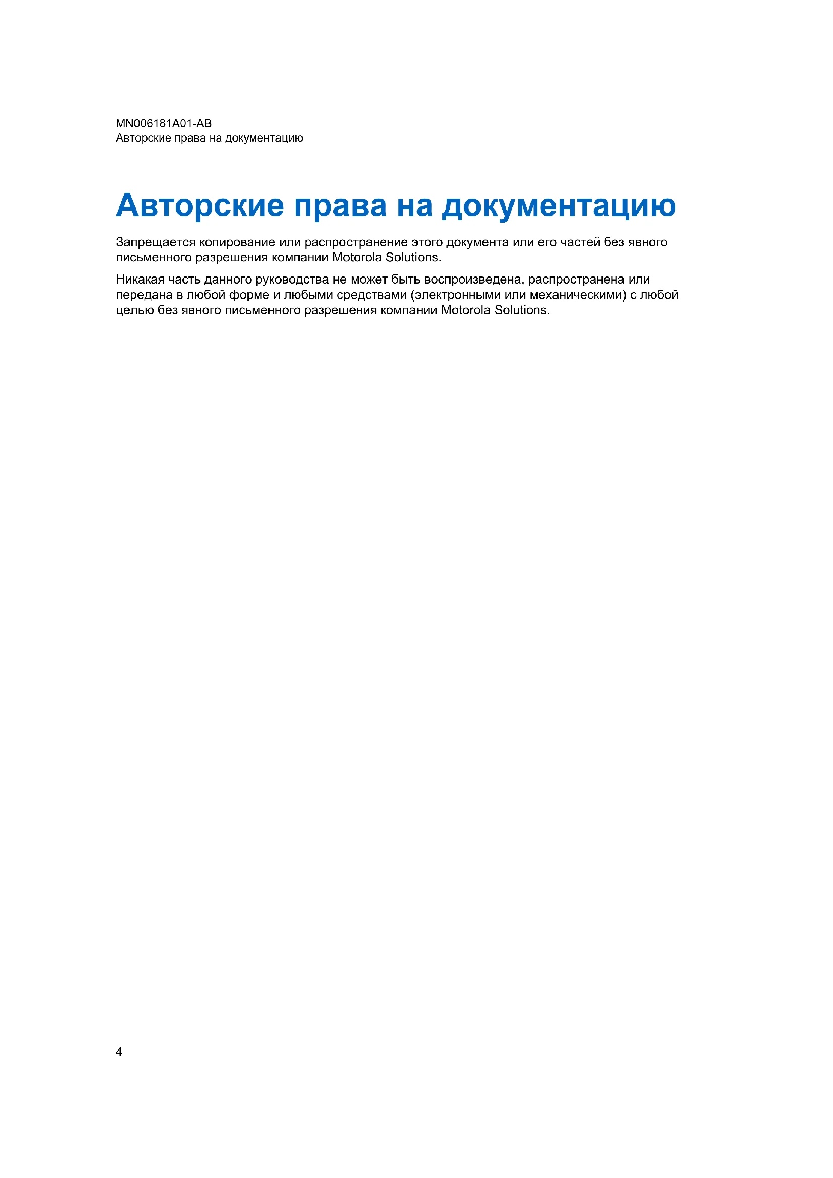 3Авторские права на документацию Запрещается копирование или распространение этого документа или его частей без явного письменного разрешения компании Motorola Solutions. Никакая часть данного руководства не может быть воспроизведена, распространена или передана в любой форме и любыми средствами (электронными или механическими) с любой целью без явного письменного разрешения компании Motorola Solutions. MN006181A01-AB Авторские права на документацию 4Отказ от ответственности Информация в данном документе прошла тщательную проверку и должна рассматриваться как надежная. Однако компания не несет ответственности за возможные неточности. Более того, компания Motorola Solutions оставляет за собой право вносить изменения в любое изделие для улучшения ясности, функциональности или структуры. Компания Motorola Solutions не несет никаких обязательств, связанных с использованием любых изделий или схем, описанных в данном документе, а также не предоставляет лицензии в рамках патентных прав или права на другие изделия. MN006181A01-AB Отказ от ответственности 5Авторские права на компьютерное программное обеспечение Описанные в данном руководстве изделия Motorola Solutions могут содержать защищенные авторскими правами компьютерные программы Motorola Solutions, хранящиеся на полупроводниковых ЗУ или других носителях. Законы США и некоторых других стран обеспечивают определенные эксклюзивные права компании Motorola Solutions в отношении защищенных авторским правом компьютерных программ, включая, помимо прочего, эксклюзивное право на копирование и воспроизведение в любой форме защищенных авторским правом компьютерных программ. В связи с этим никакие компьютерные программы компании Motorola Solutions, которые содержатся в изделиях Motorola Solutions, описанных в настоящем руководстве, не разрешается копировать, воспроизводить, изменять, подвергать инженерному анализу для создания аналога или распространять каким бы то ни было способом без явного письменного разрешения компании Motorola Solutions. Кроме того, приобретение изделий Motorola Solutions не приведет прямо, косвенно, процессуально или каким-либо иным образом к передаче лицензии на авторские права, патенты или запатентованные приложения Motorola Solutions, кроме обычной неисключительной лицензии на использование, которая возникает по закону при продаже изделия. MN006181A01-AB Авторские права на компьютерное программное обеспечение 6Информация по технике безопасности при работе с аккумуляторами, зарядными устройствами и аудиоаксессуарами В настоящем документе содержатся важные инструкции по безопасной эксплуатации. Внимательно прочтите эти инструкции и сохраните для дальнейшего использования в качестве справки. Перед началом использования зарядного устройства для аккумуляторов ознакомьтесь со всеми инструкциями и предупреждениями, размещенными на: