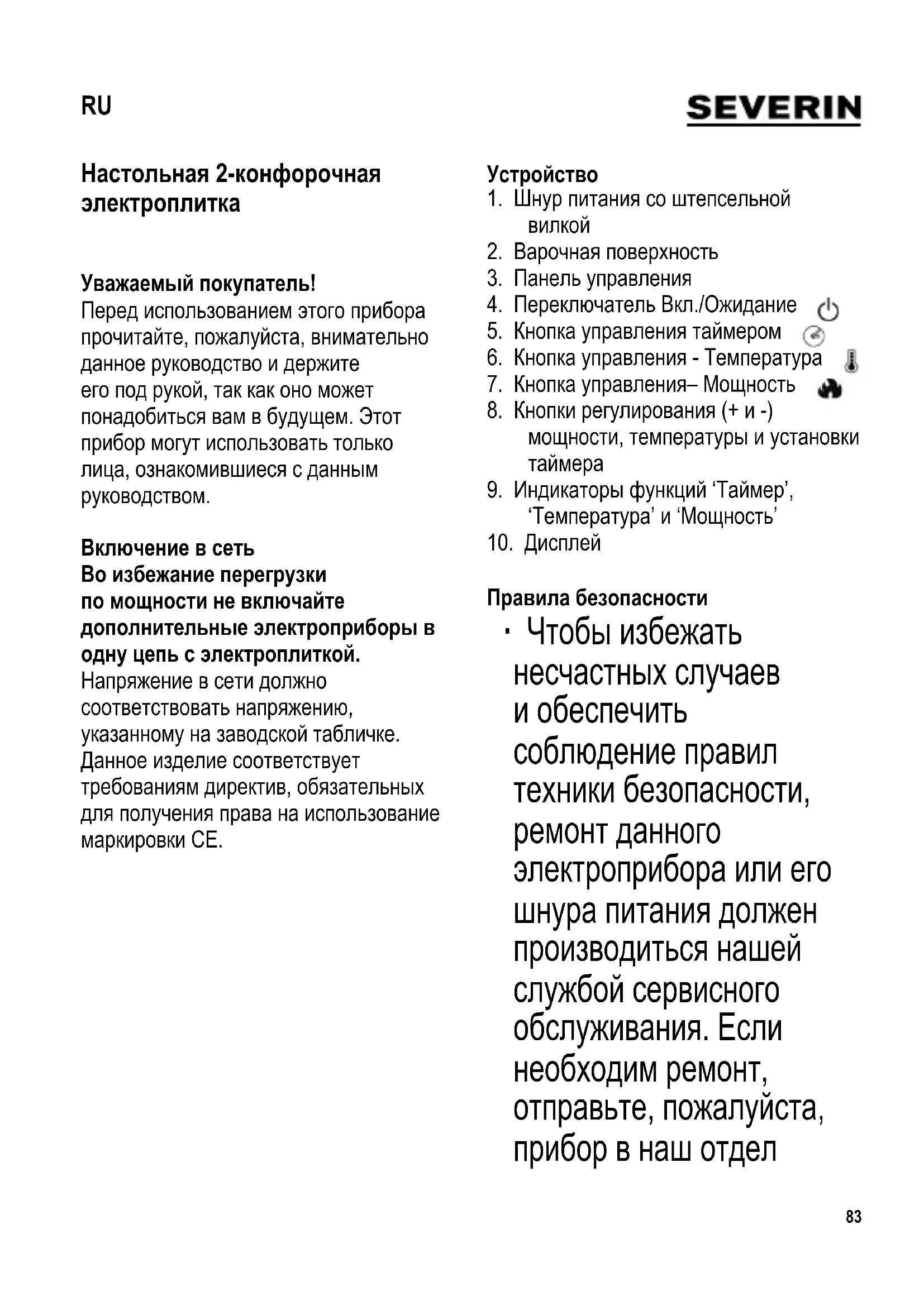 Настольная 2-конфорочная электроплитка Уважаемый покупатель! Перед использованием этого прибора прочитайте, пожалуйста, внимательно данное руководство и держите его под рукой, так как оно может понадобиться вам в будущем. Этот прибор могут использовать только лица, ознакомившиеся с данным руководством. Включение в сеть Во избежание перегрузки по мощности не включайте дополнительные электроприборы в одну цепь с электроплиткой. Напряжение в сети должно соответствовать напряжению, указанному на заводской табличке. Данное изделие соответствует требованиям директив, обязательных для получения права на использование маркировки СЕ.