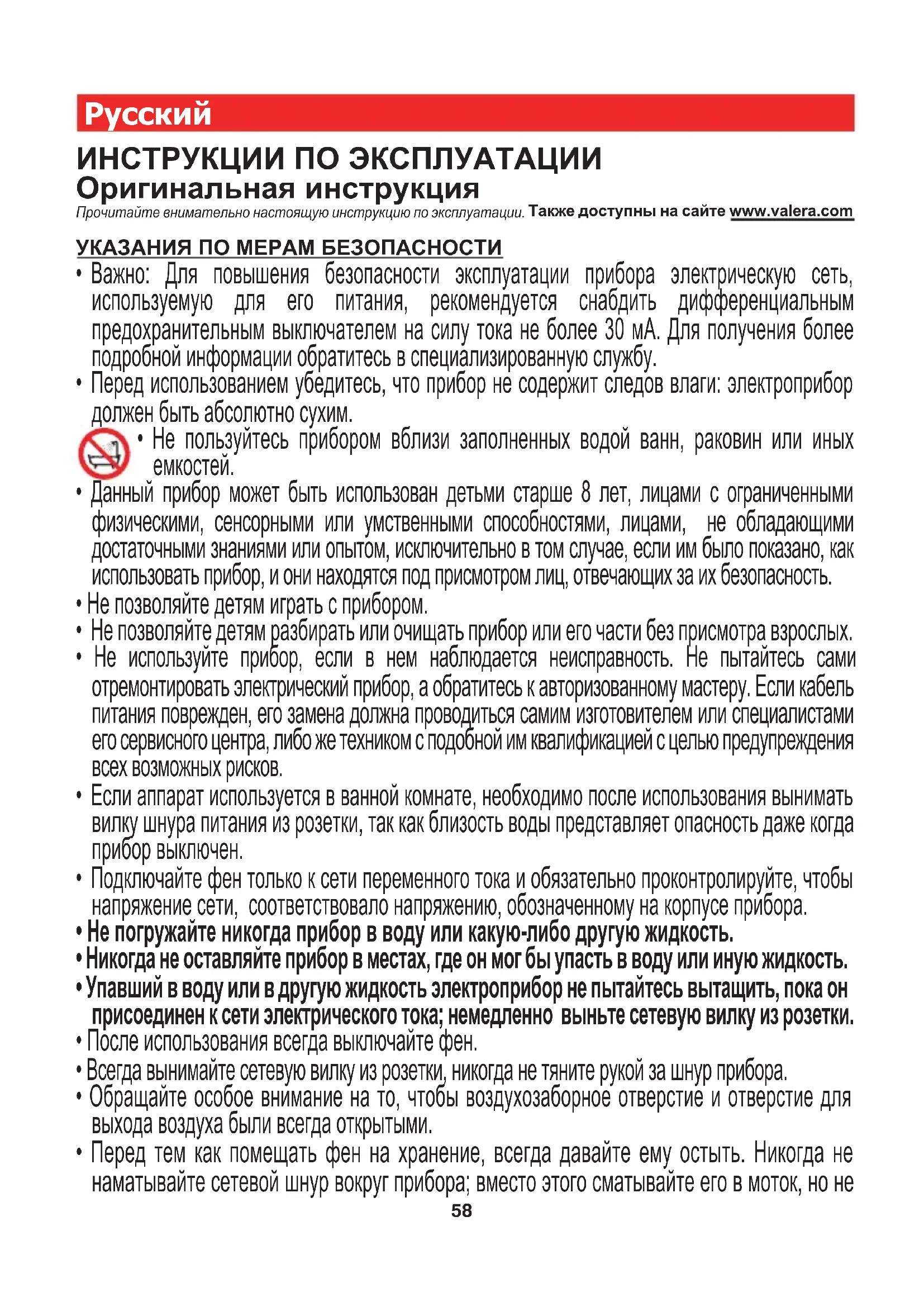 ПОРТАТИВНЫЙ ФЕН ДЛЯ ПРОФЕССИОНАЛЬНОГО ИСПОЛЬЗОВАНИЯ60 Насадка-концентратор Благодаря этой насадке вы можете точно направлять поток горячего или прохладного воздуха на отдельные пряди волос. Диффузор / Моделирующая насадка (для приборов укомплектованных данной принадлежностью) насадка позволяет придавать прическе объем и делает кудрявые или завитые волосы естественно мягкими. Возьмите прядь влажных (но не мокрых) волос и, разминая их в ладони, пропускайте горячий воздух сквозь пальцы насадки. Установка диффузора: см, рис. 1. ВНИМАНИЕ: При использовании диффузора должен использоваться режим, в котором переключатель температуры / переключатель мощности фена находятся в минимальной позиции. Фильтр (для моделей, имеющих эту опцию) В фене, под воздухозаборной решеткой, вмонтирован съемный фильтр. Его назначение – задерживать пылинки и волосы, которые могли бы проникнуть внутрь прибора. Очистку фильтра можно проводить проточной водой. Для этого необходимо сначала снять воздухозаборную решетку, а затем вынуть фильтр. После очистки необходимо проконтролировать, чтобы фильтр находился в абсолютно сухом состоянии перед его повторным использованием. После очистки установите на место фильтр, а затем воздухозаборную решетку. Ionic Care (для моделей, имеющих эту опцию) Данная функция обеспечивается генератором, вырабатывающим миллионы очищающих воздух отрицательно заряженных ионов. Что такое ионы? Ионы представляют собой присутствующие в воздухе частицы, обладающие электрическим зарядом. Отрицательно заряженные ионы помогают очищению воздуха, нейтрализуя ионы с положительным зарядом, которые, наоборот, способствуют ухудшению его состояния, удерживая в атмосфере значительное число загрязняющих элементов. Лучшее увлажнение волос Отрицательно заряженные ионы способствуют сохранению необходимого увлажнения для ваших волос. Они дробят частицы воды, находящиеся на только что вымытых волосах, тем самым позволяя стержням волос поглощать ее большее количество, что восстанавливает внутри них естественный баланс влажности. Эффект бальзама Лучшее смачивание способствует кондиционированию ваших волос, оказывает восстанавливающий эффект и делает их более мягкими и легче расчесываемыми, увеличивая их объем и блеск. Отсутствие статического электричества и эффекта “разлетающихся" волос Отрицательно заряженные ионы способствуют снижению статического электричества и эффекта “разлетающихся" волос (когда волосы торчат в разные стороны), а также делают их более гладкими. Очистительный эффект Загрязняющие частицы, находящиеся в воздухе (с положительным зарядом или нейтральные) притягиваются к отрицательно заряженным ионам, испускаемым феном, при этом их вес увеличивается и под действием силы тяжести они падают на пол, делая воздух более чистым. ОЧИСТКА И ТЕХНИЧЕСКОЕ ОБСЛУЖИВАНИЕ Перед очисткой прибора обязательно вынуть сначала вилку из розетки! Очистку можно проводить с помощью влажной тряпки. Прибор нельзя ни в коем случае промывать водой или любой другой жидкостью! Защищайте фен от попадания в него пыли. Можно очищать воздухозаборную решетку щеткой или кистью. Категорически запрещается производить чистку фена с применением моющих средств, растворителей, алкоголя и различных химических составов.