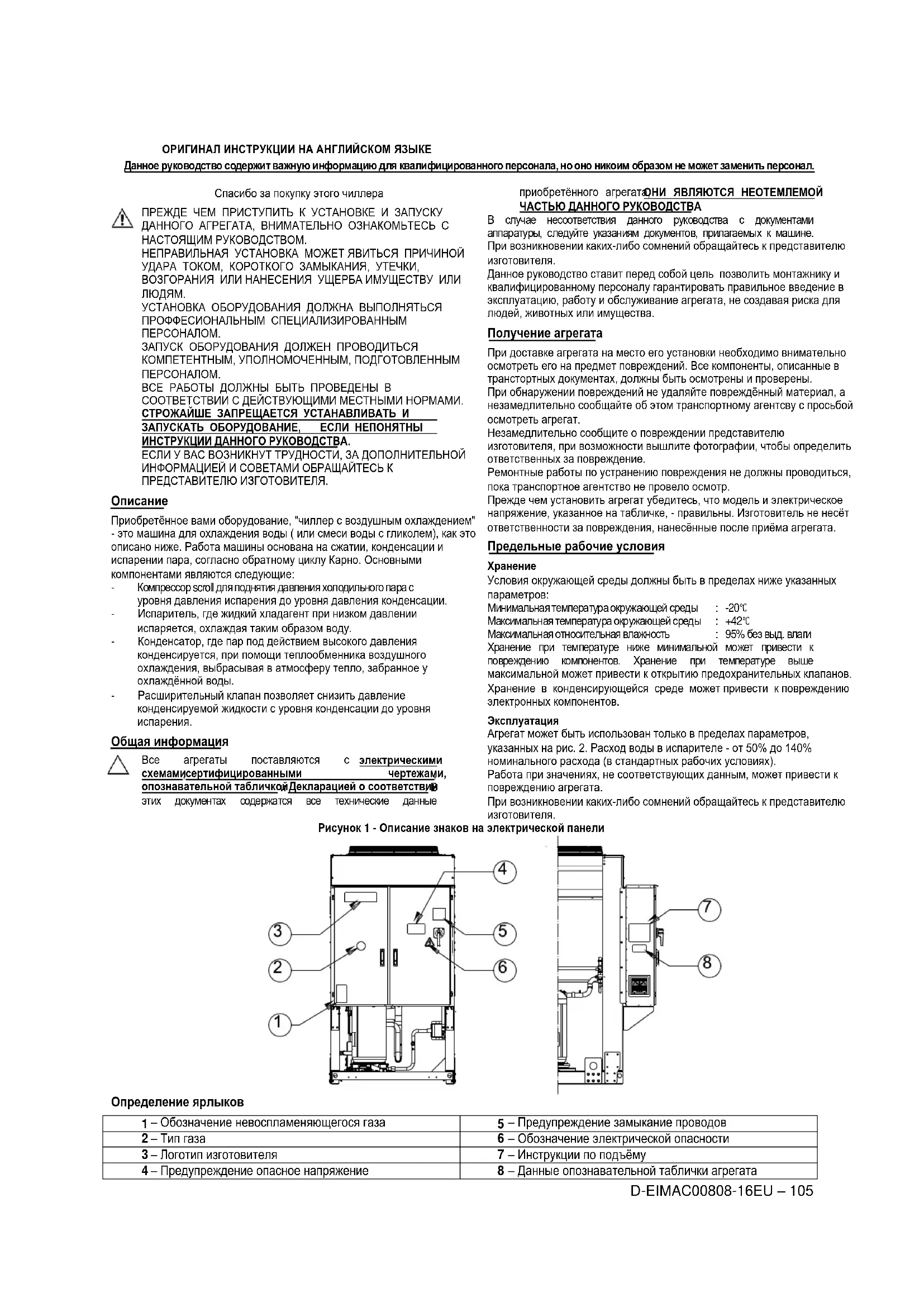 Максимальная относительная влажность : 95% без выд. влаги Хранение при температуре ниже минимальной может привести к повреждению компонентов. Хранение при температуре выше максимальной может привести к открытию предохранительных клапанов. Хранение в конденсирующейся среде может привести к повреждению электронных компонентов. Эксплуатация Агрегат может быть использован только в пределах параметров, указанных на рис. 2. Расход воды в испарителе - от 50% до 140% номинального расхода (в стандартных рабочих условиях). Работа при значениях, не соответствующих данным, может привести к повреждению агрегата. При возникновении каких-либо сомнений обращайтесь к представителю изготовителя. Рисунок 1 - Описание знаков на электрической панели Определение ярлыков
