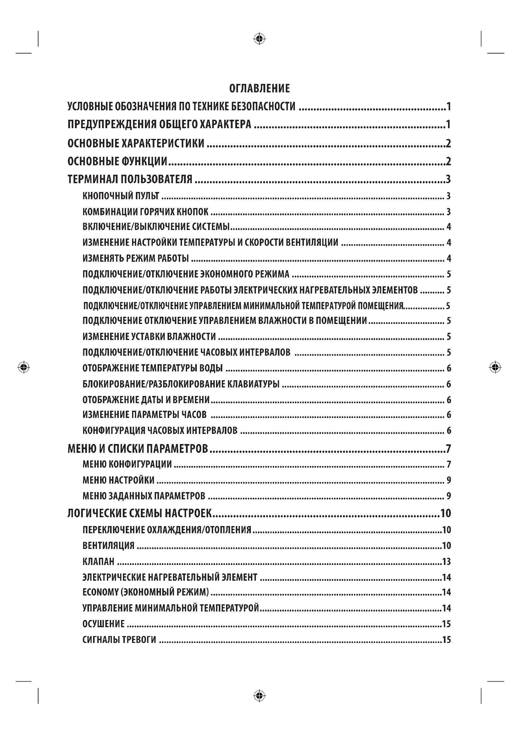 ПРЕДУПРЕЖДЕНИЯ ОБЩЕГО ХАРАКТЕРА 1 ОСНОВНЫЕ ХАРАКТЕРИСТИКИ 2 ОСНОВНЫЕ ФУНКЦИИ 2 ТЕРМИНАЛ ПОЛЬЗОВАТЕЛЯ 3 КНОПОЧНЫЙ ПУЛЬТ 3 КОМБИНАЦИИ ГОРЯЧИХ КНОПОК 3 ВКЛЮЧЕНИЕ/ВЫКЛЮЧЕНИЕ СИСТЕМЫ 4 ИЗМЕНЕНИЕ НАСТРОЙКИ ТЕМПЕРАТУРЫ И СКОРОСТИ ВЕНТИЛЯЦИИ 4 ИЗМЕНЯТЬ РЕЖИМ РАБОТЫ 4 ПОДКЛЮЧЕНИЕ/ОТКЛЮЧЕНИЕ ЭКОНОМНОГО РЕЖИМА 5 ПОДКЛЮЧЕНИЕ/ОТКЛЮЧЕНИЕ РАБОТЫ ЭЛЕКТРИЧЕСКИХ НАГРЕВАТЕЛЬНЫХ ЭЛЕМЕНТОВ 5 ПОДКЛЮЧЕНИЕ/ОТКЛЮЧЕНИЕ УПРАВЛЕНИЕМ МИНИМАЛЬНОЙ ТЕМПЕРАТУРОЙ ПОМЕЩЕНИЯ