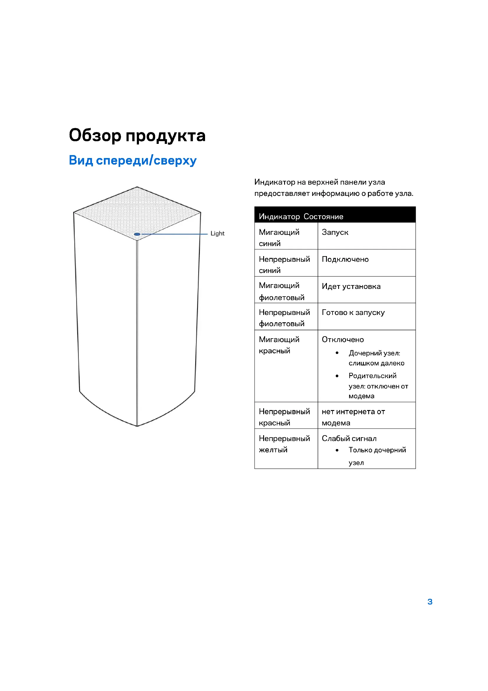 Скорость отправки — это скорость, с которой вы можете передавать данные в Интернет. Примечание. Скорость подключения к Интернету зависит от множества факторов, в том числе от тарифа у поставщика услуг Интернета, от локального и всемирного трафика в Интернете, а также от количества одновременно подключенных к Интернету устройств у вас дома.18 Родительский контроль С помощью родительского контроля можно управлять временем, когда у ваших детей будет доступ к Интернету, и доступными ресурсами. Можно приостановить доступ к Интернету с определенных устройств или запретить доступ к определенным сайтам.19 Приоритет устройств Можно выбрать до трех устройств с приоритетным подключением к Интернету. Эти устройства, как проводные, так и беспроводные, всегда будут располагать наилучшим подключением к Интернету. Система Velop использует проверку скорости, чтобы определить, как лучше распределить ресурсы сети Wi-Fi среди приоритетных устройств. Остальные устройства будут использовать оставшуюся пропускную способность подключения. Приоритетные устройства отображаются на панели мониторинга.20 Уведомления При наличии нескольких узлов система Velop может уведомлять об отключении дополнительных узлов. Дополнительными считаются все узлы, не подключенные кабелем к модему. Для получения уведомлений от Velop необходимо включить уведомления в настройках мобильного устройства.21 Администрирование Velop На экране «Администрирование Velop» можно изменить пароль и подсказку администратора, а также проверить различные данные (номер модели, серийный номер, данные IP-адреса) всех узлов вашей сети Wi-Fi. Можно автоматически отправлять отчеты о сбоях в Linksys, чтобы помочь нам в улучшении беспроводных устройств. Также можно вручную отправлять в Linksys сообщения об определенных проблемах.22 Вместе с описанием неполадки будет отправлена следующая информация: