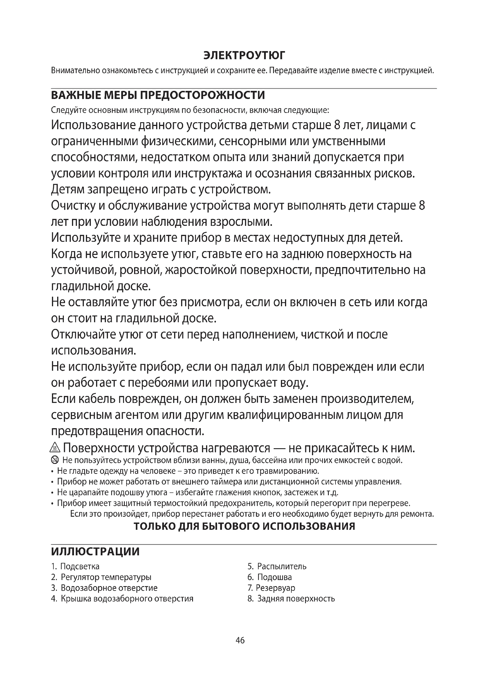 AE46 ЭЛЕКТРОУТЮГ Внимательно ознакомьтесь с инструкцией и сохраните ее. Передавайте изделие вместе с инструкцией. ВАЖНЫЕ МЕРЫ ПРЕДОСТОРОЖНОСТИ Следуйте основным инструкциям по безопасности, включая следующие: Использование данного устройства детьми старше 8 лет, лицами с ограниченными физическими, сенсорными или умственными способностями, недостатком опыта или знаний допускается при условии контроля или инструктажа и осознания связанных рисков. Детям запрещено играть с устройством. Очистку и обслуживание устройства могут выполнять дети старше 8 лет при условии наблюдения взрослыми. Используйте и храните прибор в местах недоступных для детей. Когда не используете утюг, ставьте его на заднюю поверхность на устойчивой, ровной, жаростойкой поверхности, предпочтительно на гладильной доске. Не оставляйте утюг без присмотра, если он включен в сеть или когда он стоит на гладильной доске. Отключайте утюг от сети перед наполнением, чисткой и после использования. Не используйте прибор, если он падал или был поврежден или если он работает с перебоями или пропускает воду. Если кабель поврежден, он должен быть заменен производителем, сервисным агентом или другим квалифицированным лицом для предотвращения опасности. h Поверхности устройства нагреваются — не прикасайтесь к ним. b Не пользуйтесь устройством вблизи ванны, душа, бассейна или прочих емкостей с водой.
