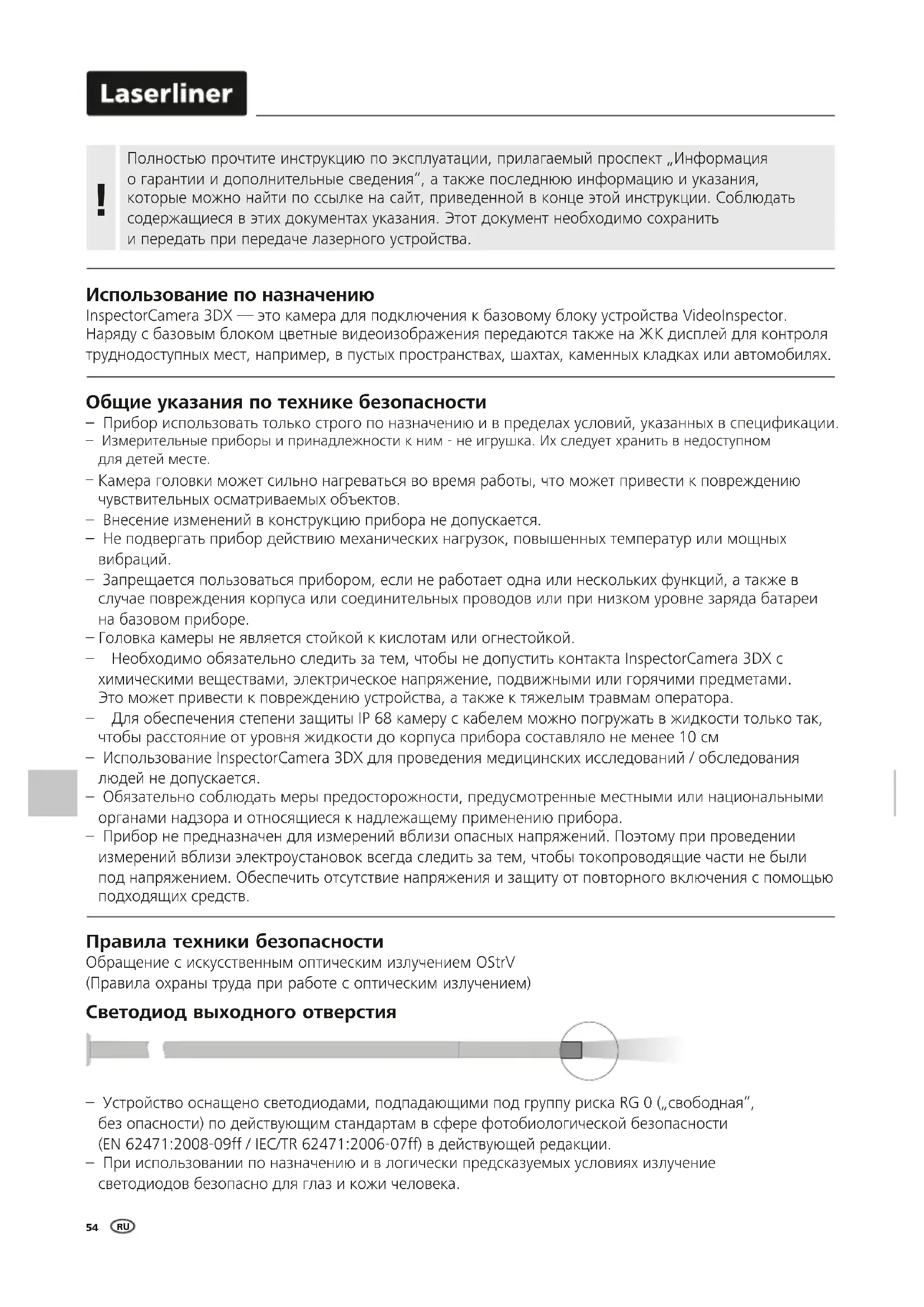 – Запрещается пользоваться прибором, если не работает одна или нескольких функций, а также в случае повреждения корпуса или соединительных проводов или при низком уровне заряда батареи на базовом приборе. – Головка камеры не является стойкой к кислотам или огнестойкой. – Необходимо обязательно следить за тем, чтобы не допустить контакта InspectorCamera 3DX с химическими веществами, электрическое напряжение, подвижными или горячими предметами. Это может привести к повреждению устройства, а также к тяжелым травмам оператора. – Для обеспечения степени защиты IP 68 камеру с кабелем можно погружать в жидкости только так, чтобы расстояние от уровня жидкости до корпуса прибора составляло не менее 10 см – Использование InspectorCamera 3DX для проведения медицинских исследований / обследования людей не допускается. – Обязательно соблюдать меры предосторожности, предусмотренные местными или национальными органами надзора и относящиеся к надлежащему применению прибора. – Прибор не предназначен для измерений вблизи опасных напряжений. Поэтому при проведении измерений вблизи электроустановок всегда следить за тем, чтобы токопроводящие части не были под напряжением. Обеспечить отсутствие напряжения и защиту от повторного включения с помощью подходящих средств. Правила техники безопасности Обращение с искусственным оптическим излучением OStrV (Правила охраны труда при работе с оптическим излучением) Светодиод выходного отверстия – Устройство оснащено светодиодами, подпадающими под группу риска RG 0 („свободная“, без опасности) по действующим стандартам в сфере фотобиологической безопасности (EN 62471:2008-09ff / IEC/TR 62471:2006-07ff) в действующей редакции. – При использовании по назначению и в логически предсказуемых условиях излучение светодиодов безопасно для глаз и кожи человека. Полностью прочтите инструкцию по эксплуатации, прилагаемый проспект „Информация о гарантии и дополнительные сведения“, а также последнюю информацию и указания, которые можно найти по ссылке на сайт, приведенной в конце этой инструкции. Соблюдать содержащиеся в этих документах указания. Этот документ необходимо сохранить и передать при передаче лазерного устройства. !InspectorCamera 3DX