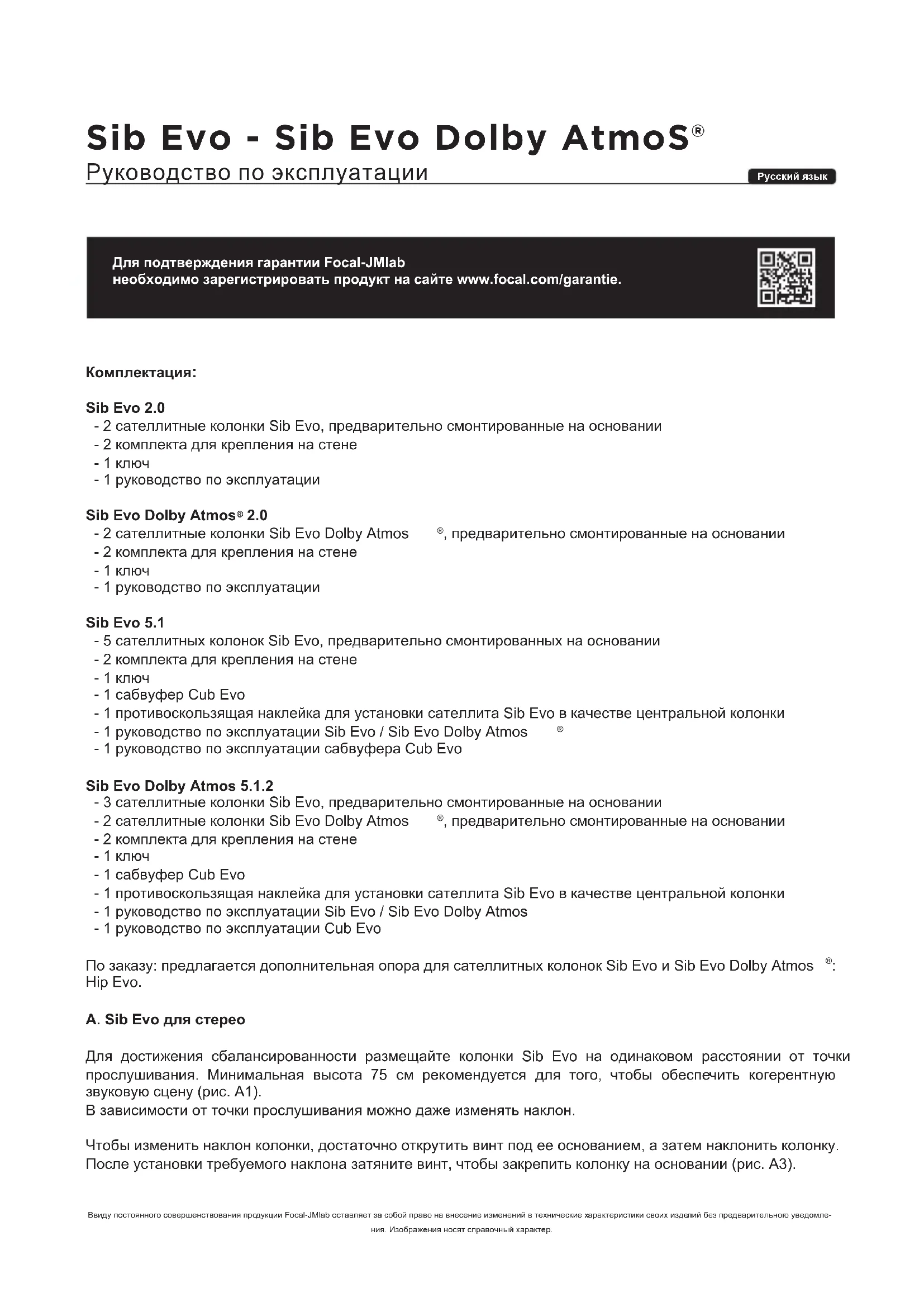 Hip Evo. A. Sib Evo для стерео Для достижения сбалансированности размещайте колонки Sib Evo на одинаковом расстоянии от точки прослушивания. Минимальная высота 75 см рекомендуется для того, чтобы обеспечить когерентную звуковую сцену (рис. A1). В зависимости от точки прослушивания можно даже изменять наклон. Чтобы изменить наклон колонки, достаточно открутить винт под ее основанием, а затем наклонить колонку. После установки требуемого наклона затяните винт, чтобы закрепить колонку на основании (рис. А3). Ввиду постоянного совершенствования продукции Focal-JMlab оставляет за собой право на внесение изменений в технические характеристики своих изделий без предварительного уведомле- ния. Изображения носят справочный характер.Notice_SibEvo_SibEvo DolbyAtmos.indd 36 21/02/17 12:0637 Sib Evo - Sib Evo Dolby AtmoS® Руководство по эксплуатации B. Sib Evo в домашнем кинотеатре 5.1